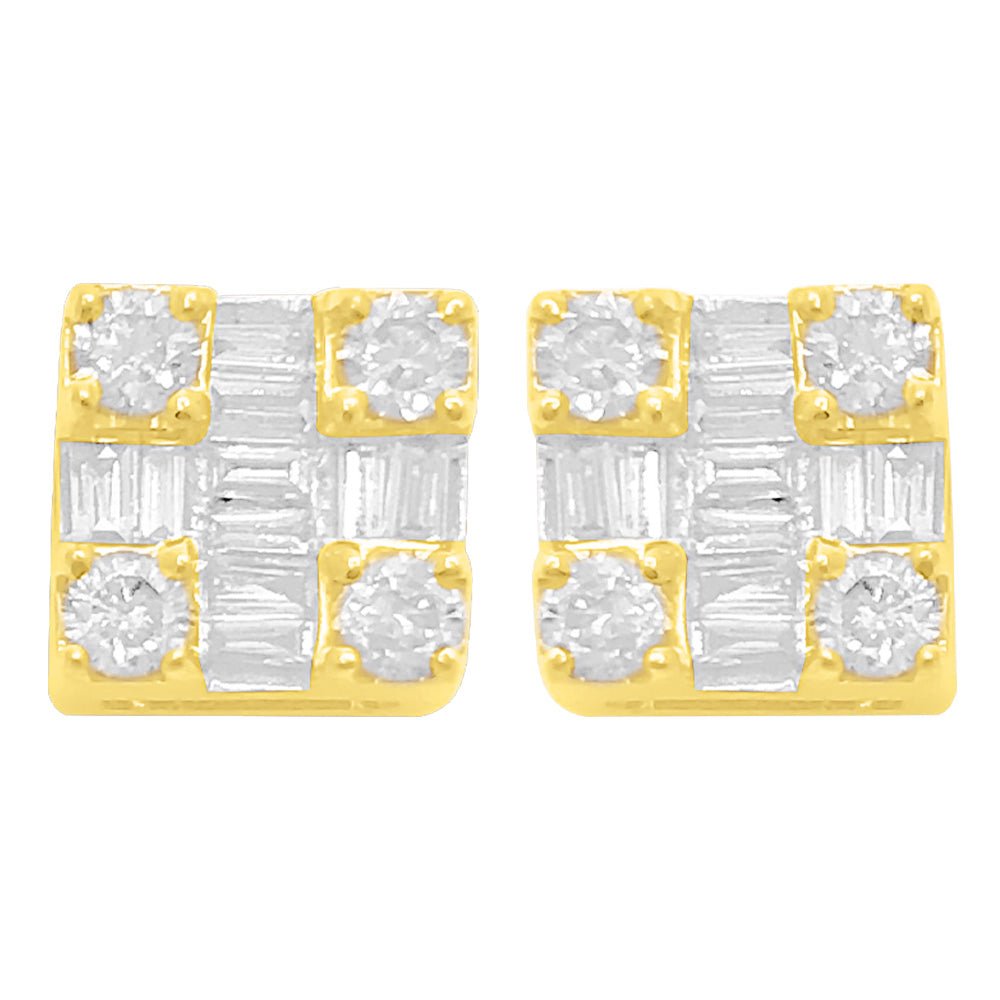 Clean Box Baguette Diamond Earrings .35cttw 10K Yellow Gold. Features round cut and baguette cut natural diamonds prong set. Ice your ears up with these shiny all real diamond hip hop earrings. Diamonds are hand set with prongs with perfection. Order your iced out diamond earrings today.