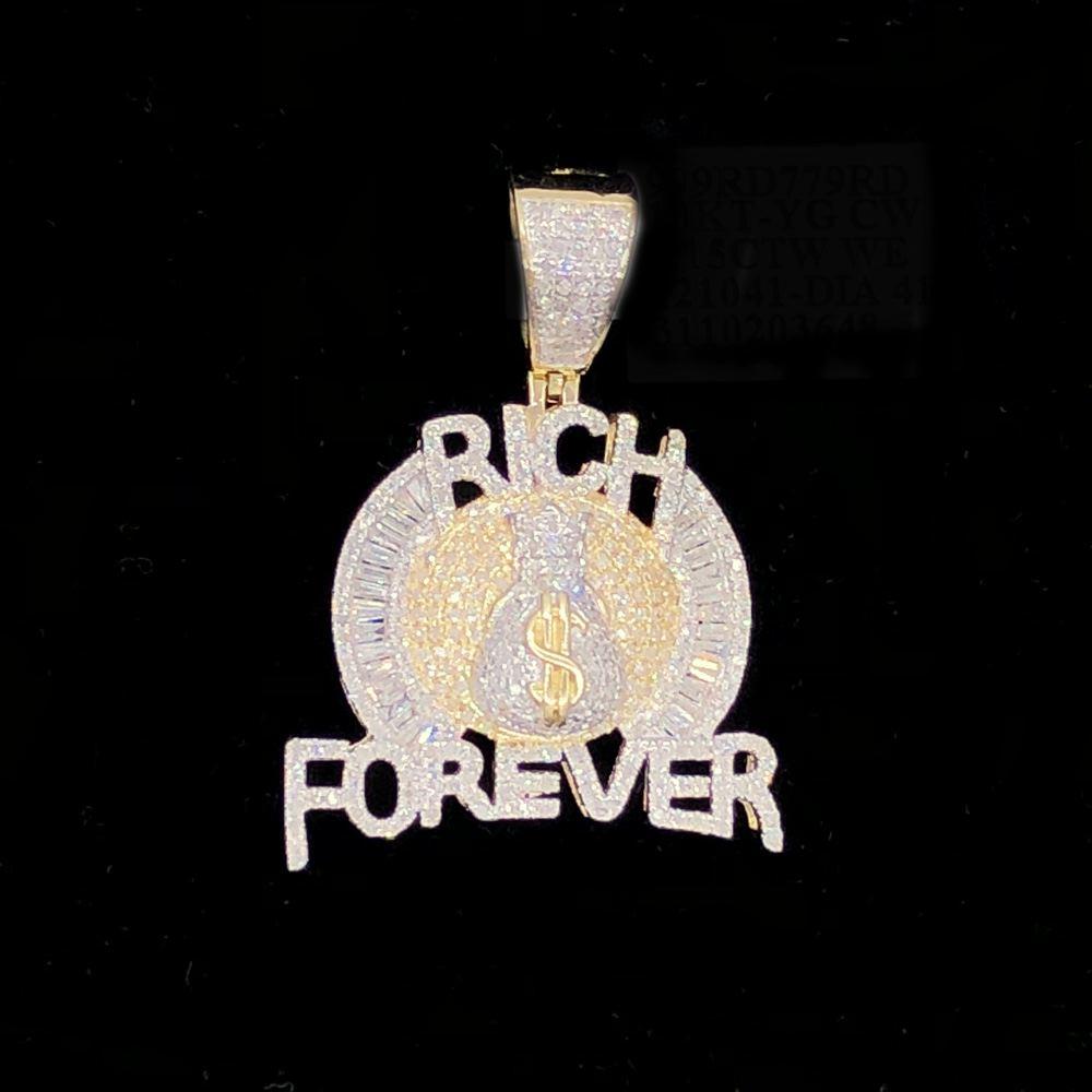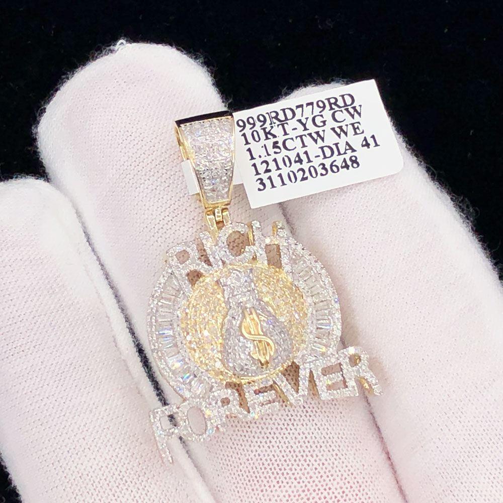 Rich Forever Money Bag Baguette Diamond Pendant 1.15cttw 10K Yellow Gold. Solid 10K Yellow Gold with Genuine Diamonds Round Cut and hand set. Intricate details with precision micro pave prong setting. Real bling bling diamond pendant iced out. All Real Diamond Hip Hop Jewelry with nice details and quality at an affordable price.
