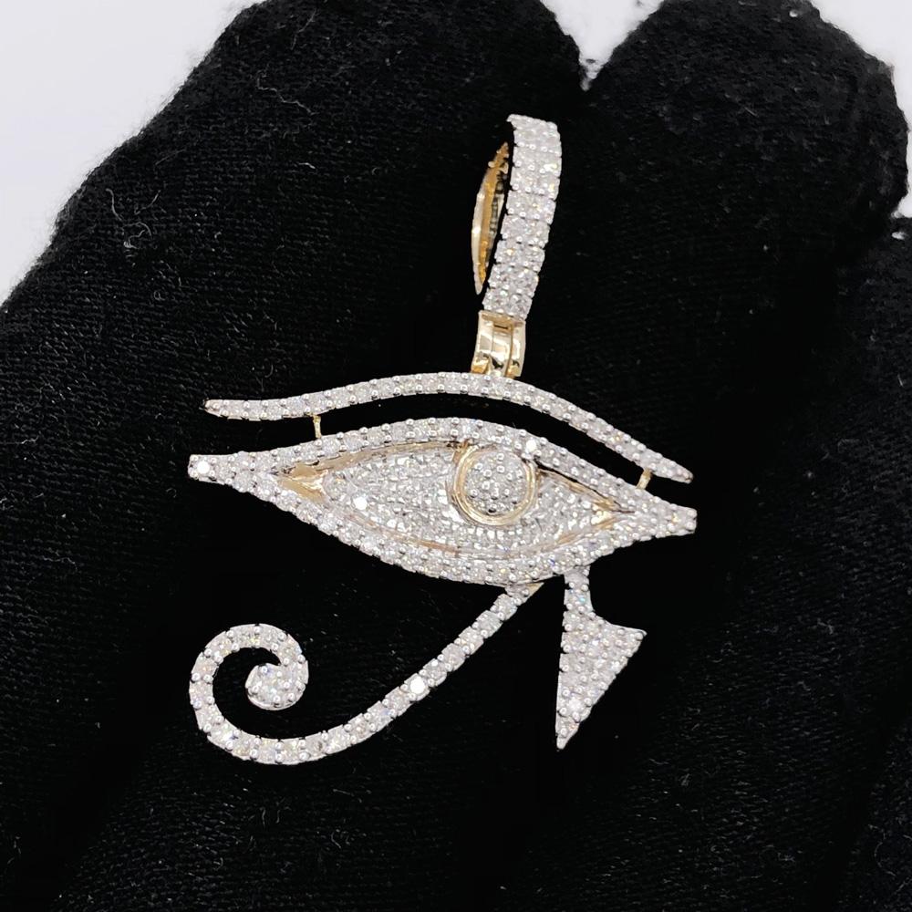 The Eye of Ra Diamond Pendant .85cttw 10K Yellow Gold. Solid 10K Yellow Gold with Round Cut Genuine Diamonds hand set. Intricate details with precision micro pave prong setting. Real bling bling diamond pendant iced out. All Real Diamond Hip Hop Jewelry with nice details and quality at an affordable price.
