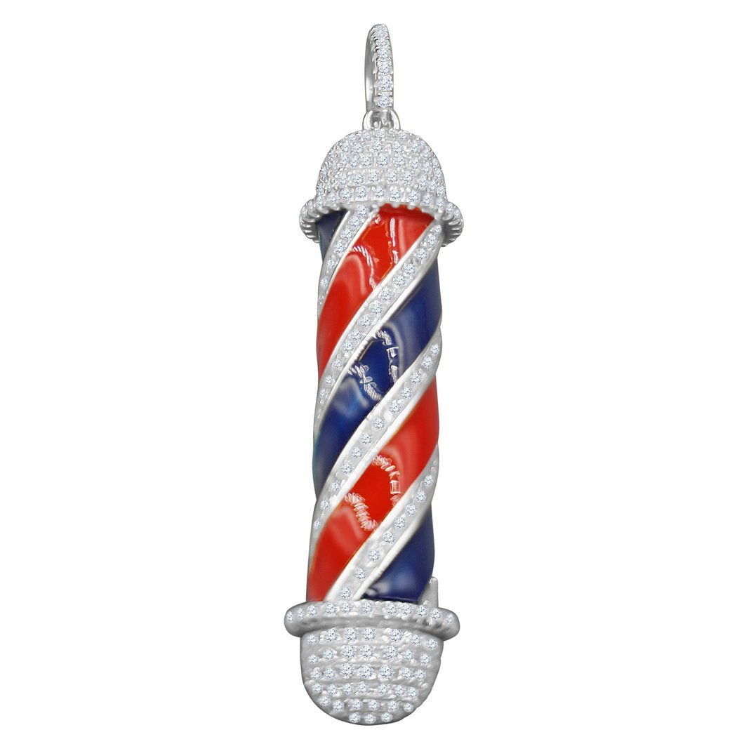 .925 Sterling Silver Barber Pole Enamel VVS CZ Iced Out Pendant. Crafted from Solid .925 Sterling Silver with an incredible bling bling shine. Limited Edition Iced Out Hip Hop Pendant. Stones are VVS Simulated Diamonds Prong Set, the same way genuine diamond hip hop jewelry is made. Stand out from the crowd with this this detailed quality made iced out pendant.