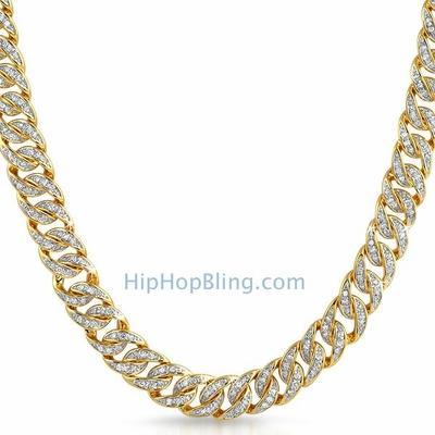 .925 Sterling Silver CZ Gold Cuban Chain 10MM. Hand crafted with Fine .925 Sterling Silver and 18K Gold wrapped over and over for the longest lasting shine possible. Great quality and craftsmanship on this bling bling Cuban Chain. Looks like $15,000.00 on your neck.