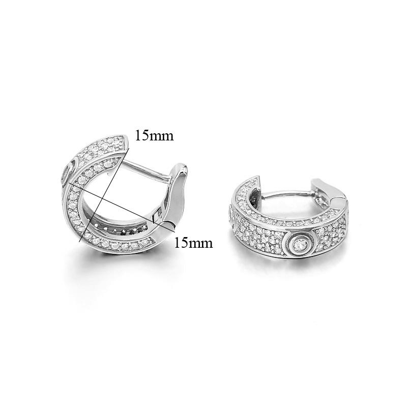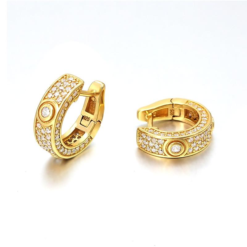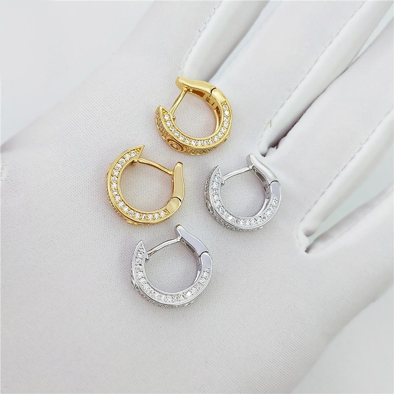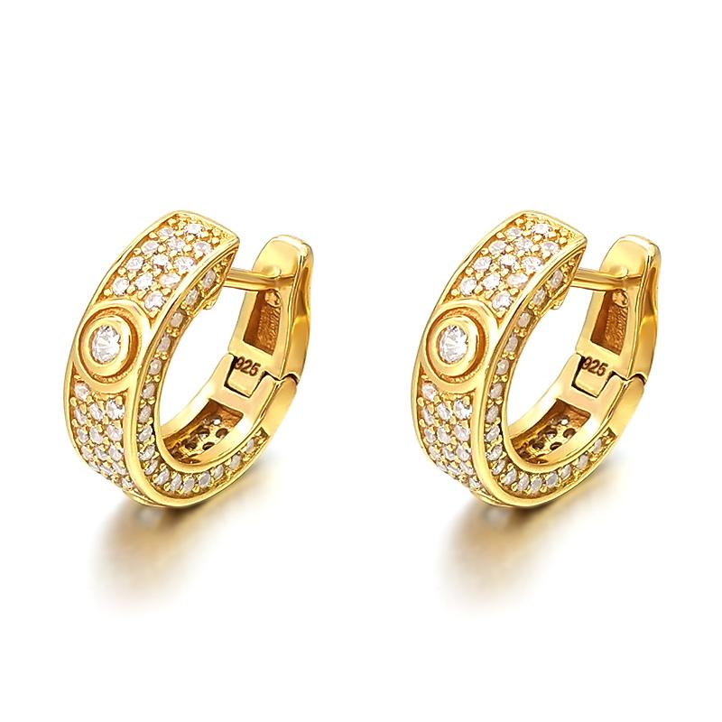 3D Pave Designer Huggie Hoop Earrings in .925 Silver. These beautiful unisex bling bling earrings are crafted from fine .925 Sterling Silver and Wrapped in Thick Layers of Yellow or White Gold. Each and every VVS Simulated Diamond stone is hand set with prongs. Intricately detailed design elements with precision stone setting. This is just one of many amazing iced out earrings from our all new 2020 .925 Sterling Silver Earring Collection.