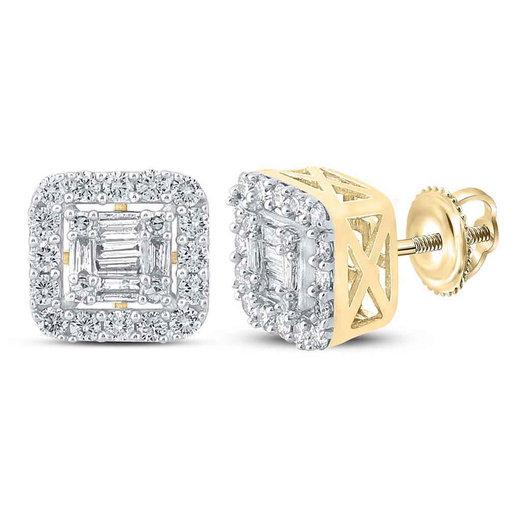 Baguette Cushion Cluster Diamond Earrings .63cttw 10K Yellow Gold. Micro Pave Prong Set round cut and baguette cut diamonds. Ice your ears up with these shiny all real diamond hip hop earrings. Diamonds are real and hand set with prongs. Order your iced out diamond earrings today.