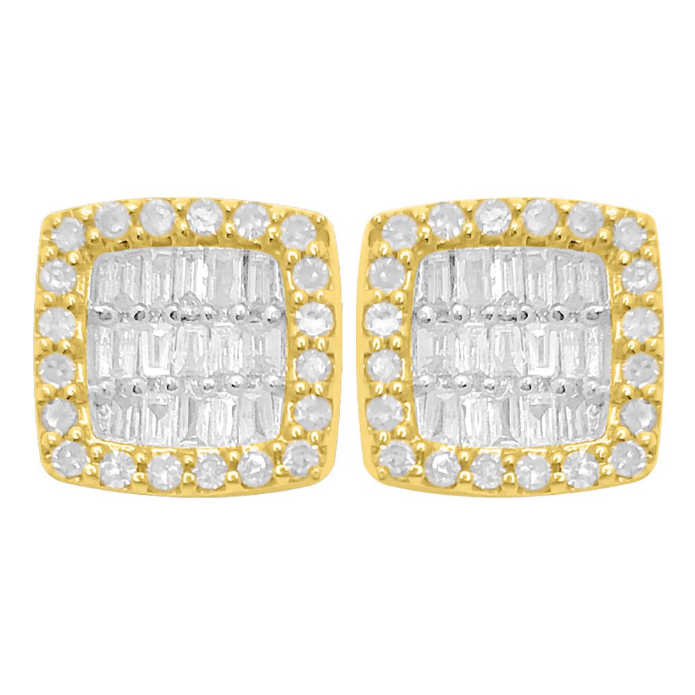 Cushion Baguette Diamond Earrings .35cttw 10K Yellow Gold. Features round cut and baguette cut natural diamonds prong set. Ice your ears up with these shiny all real diamond hip hop earrings. Diamonds are hand set with prongs with perfection. Order your iced out diamond earrings today.