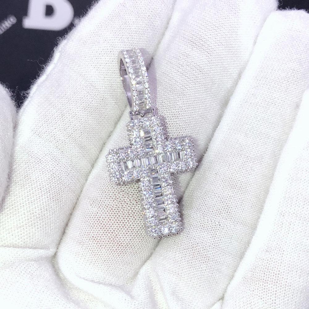 .925 Silver 3D Mini Cross Baguette VVS CZ Iced Out Pendant. Crafted from Solid .925 Sterling Silver with an incredible bling bling shine. Limited Edition Iced Out Hip Hop Pendant. Stones are VVS Simulated Diamonds Prong Set, the same way genuine diamond hip hop jewelry is made. Stand out from the crowd with this this detailed quality made iced out pendant.
