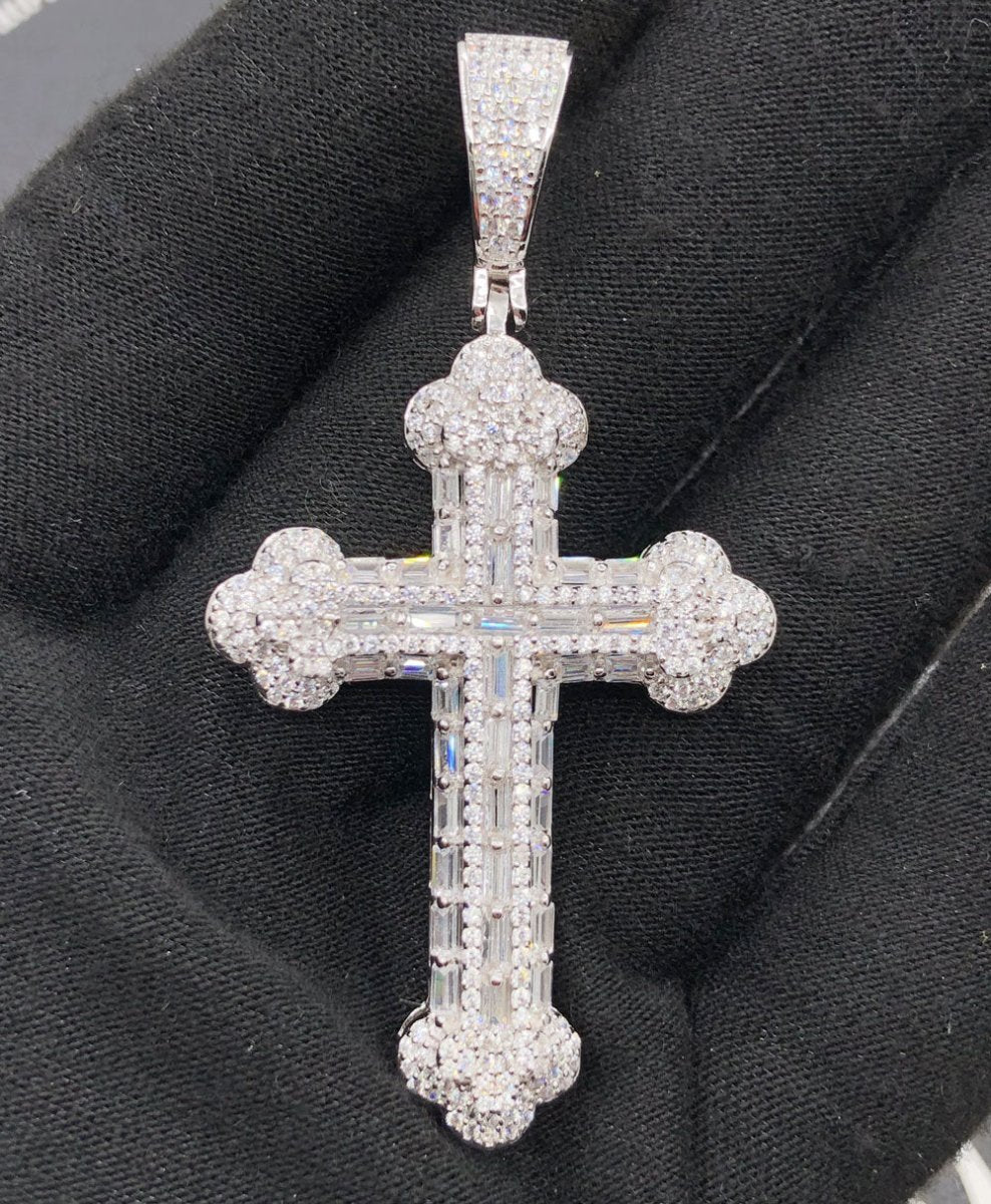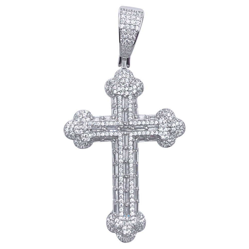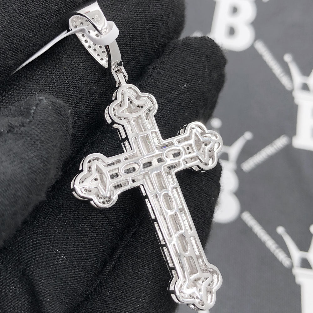 .925 Sterling Silver Antique Cross Baguette VVS CZ Iced Out Pendant. Crafted from real Solid .925 Sterling Silver with an incredible bling bling shine. Limited Edition Iced Out Hip Hop Pendant. Stones are VVS Simulated Diamonds Prong Set, the same way genuine diamond hip hop jewelry is made. Get the same look, feel and shine for less on real Silver. Stand out from the crowd with this this detailed quality made iced out pendant.