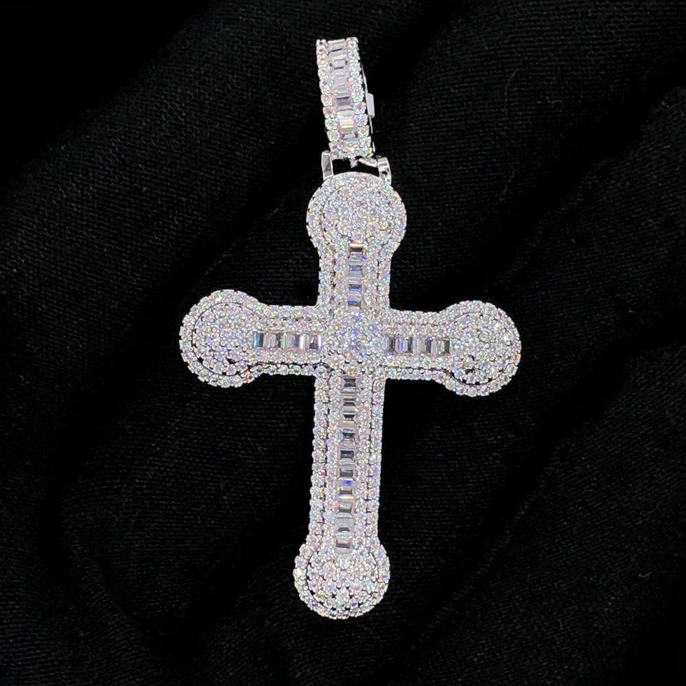 Baguette Circle Tip Cross VVS CZ Hip Hop Bling Bling Pendant. Limited Edition Iced Out Hip Hop Pendant. Stones are VVS Simulated Diamonds Prong Set, the same way genuine diamond hip hop jewelry is made. Stand out from the crowd with this this detailed quality made iced out pendant.
