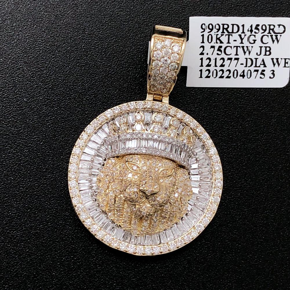 Lion Circle Baguette Diamond Pendant 2.75cttw 10K Yellow Gold. Solid 10K Yellow Gold with Round Cut and Baguette Cut Genuine Diamonds hand set. Intricate details with precision micro pave prong setting. Real bling bling diamond pendant iced out. All Real Diamond Hip Hop Jewelry with nice details and quality at an affordable price.
