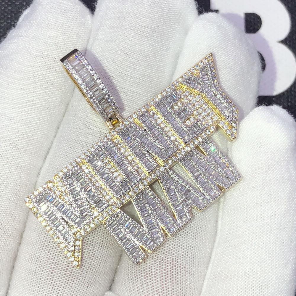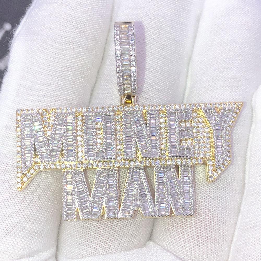Money Man Baguette Bling Bling CZ Iced Out Pendant. Limited Edition Iced Out Hip Hop Pendant. Stones are Round Cut and Baguette Cut VVS Simulated Diamonds Prong Set, the same way genuine diamond hip hop jewelry is made. Stand out from the crowd with this this detailed quality made bling bling iced out pendant.