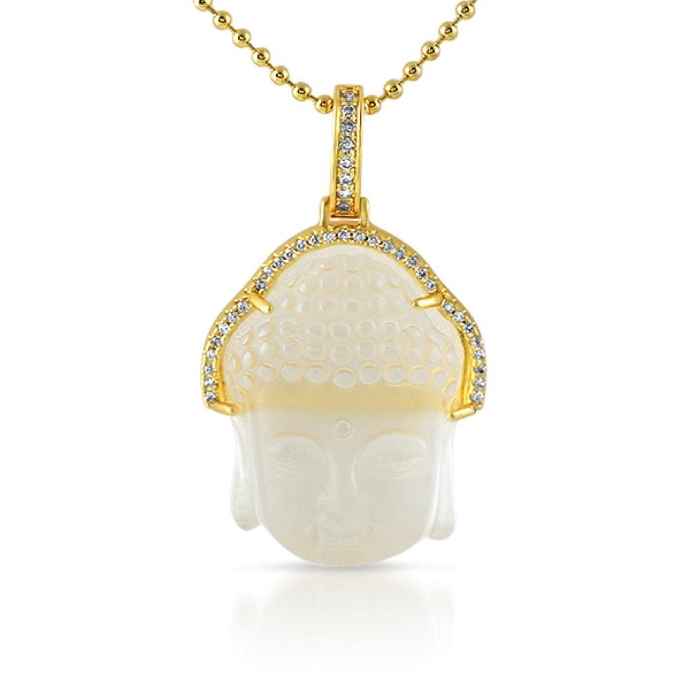 Carved Frosted Crystal Buddha Pendant Gold CZ Hair Outline.  This iced out simulated diamond pendant shines bright.  Each stone is set with prongs, no glue!  Elevate your swag and stand out from the crowd with this unique bling bling pendant around your neck.  Get the bustdown look and feel of a real diamond hip hop pendant for a fraction of the cost.  Quality finish and craftsmanship that is made to last.  Shine better and order today.