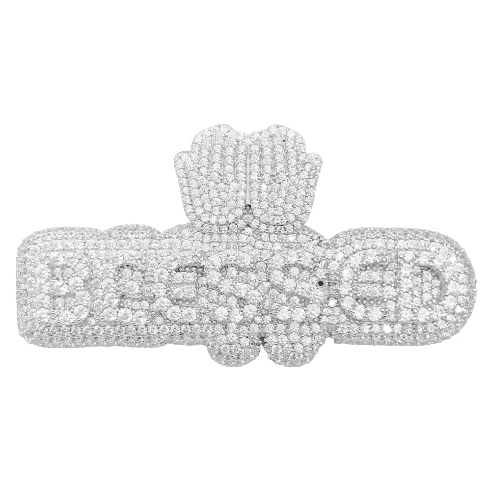 .925 Sterling Silver BLE$$ED CZ Iced Out Pendant.  Crafted from Solid .925 Sterling Silver with an incredible bling bling shine.  Limited Edition Iced Out Hip Hop Pendant.  Stones are VVS Simulated Diamonds Prong Set, the same way genuine diamond hip hop jewelry is made.  Stand out from the crowd with this this detailed quality made iced out pendant.