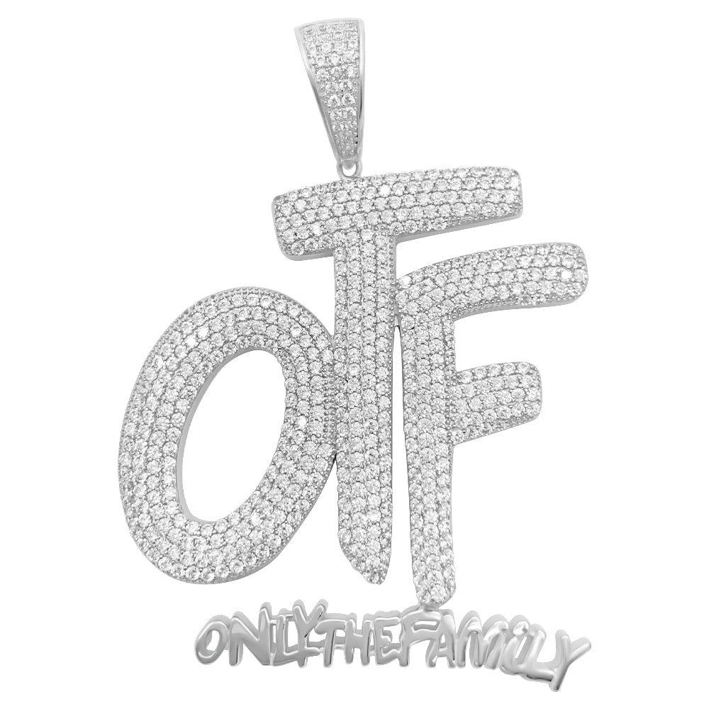.925 Sterling Silver OTF Only The Family CZ Iced Out Pendant. Crafted from Solid .925 Sterling Silver with an incredible bling bling shine. Limited Edition Iced Out Hip Hop Pendant. Stones are VVS Simulated Diamonds Prong Set, the same way genuine diamond hip hop jewelry is made. Stand out from the crowd with this this detailed quality made iced out pendant.