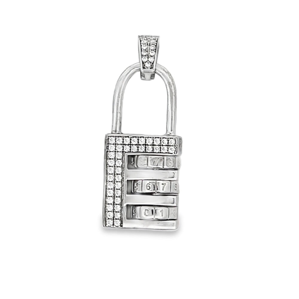Combination Pad Lock CZ Pendant .925 Sterling Silver. Quality crafted hip hop bling pendant. Crafted from fine .925 Sterling Silver and wrapped to look and feel like solid Gold at a fraction of the cost. Prong set CZ Cubic Zirconia stones, set with precision gives this iced out pendant a beautiful and bright bling bling shine. A must have in your hip hop jewelry collection.