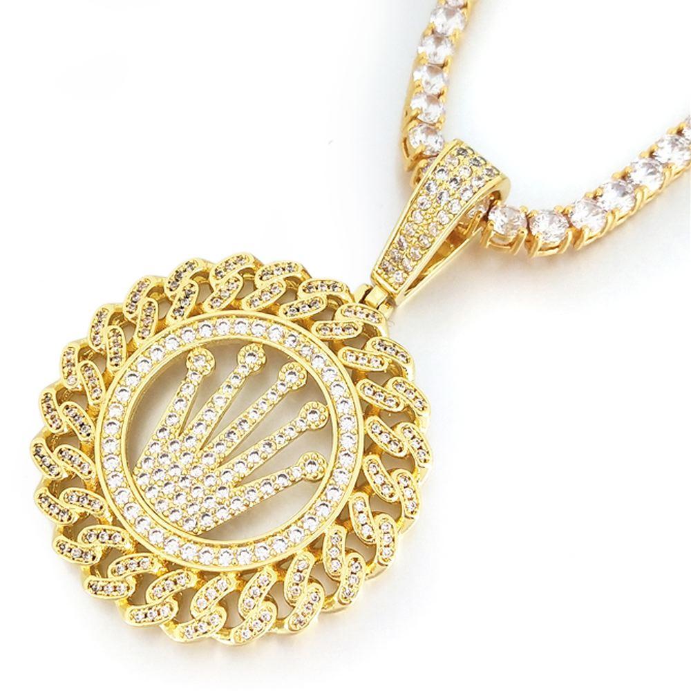 Cuban Link Crown Bling Pendant. Unique bling bling Crown Medallion with cuban link chain around the border. Beautifully crafted with precision stone setting. Hot style bling bling medallion Pendant that is available in Yellow Gold or White Gold Plating options. The VVS CZ Simulated Diamonds have a bling bling shine as if they were genuine diamonds.