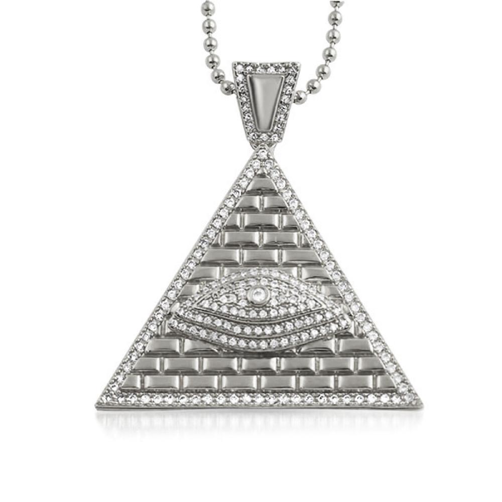 Eye of Providence CZ Bling Bling Pendant. The eye part sticks out with a 3D effect. Very detailed hip hop pendant. Rhodium plated to look and feel like White Gold. All stones are Micro Pave Hand Set, to shine and bling like genuine diamonds at a fraction of the cost.