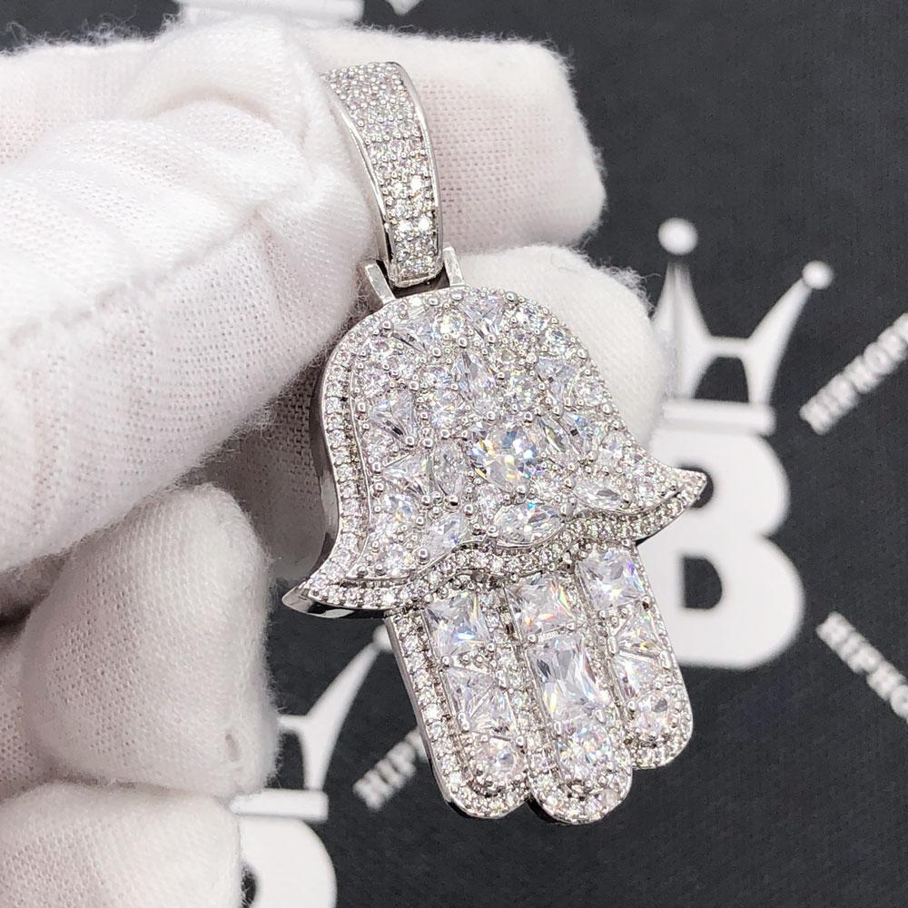 Hamsa Ice Medley CZ Hip Hop Bling Iced Out Pendant. Limited Edition Iced Out Hip Hop Pendant. Stones are VVS Simulated Diamonds Prong Set, the same way genuine diamond hip hop jewelry is made. Stand out from the crowd with this this detailed quality made iced out pendant.