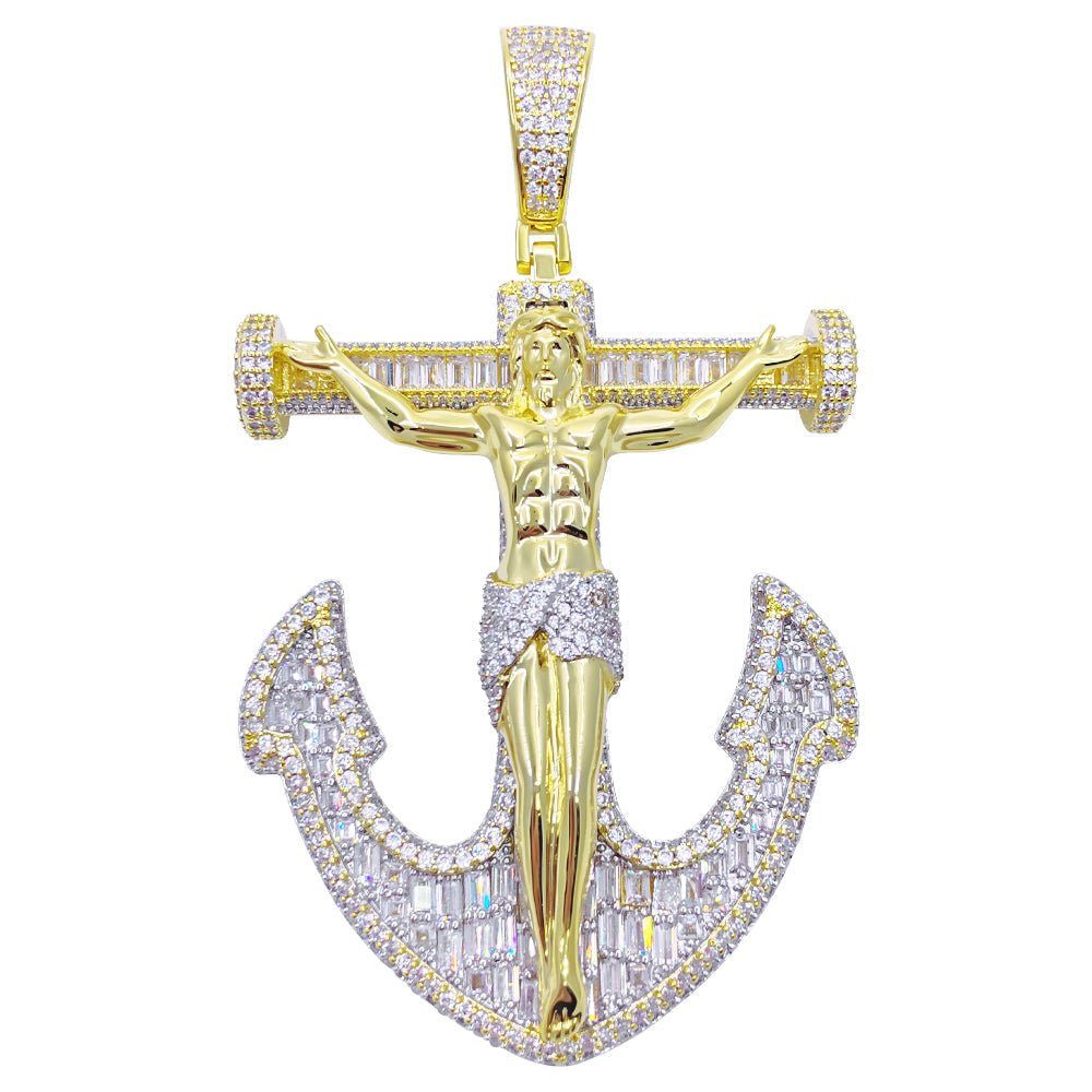 Jesus Anchor Baguette VVS CZ Hip Hop Iced Out Pendant. Limited Edition Iced Out Hip Hop Pendant. Stones are VVS Simulated Diamonds Prong Set, the same way genuine diamond hip hop jewelry is made. Stand out from the crowd with this this detailed quality made iced out pendant.