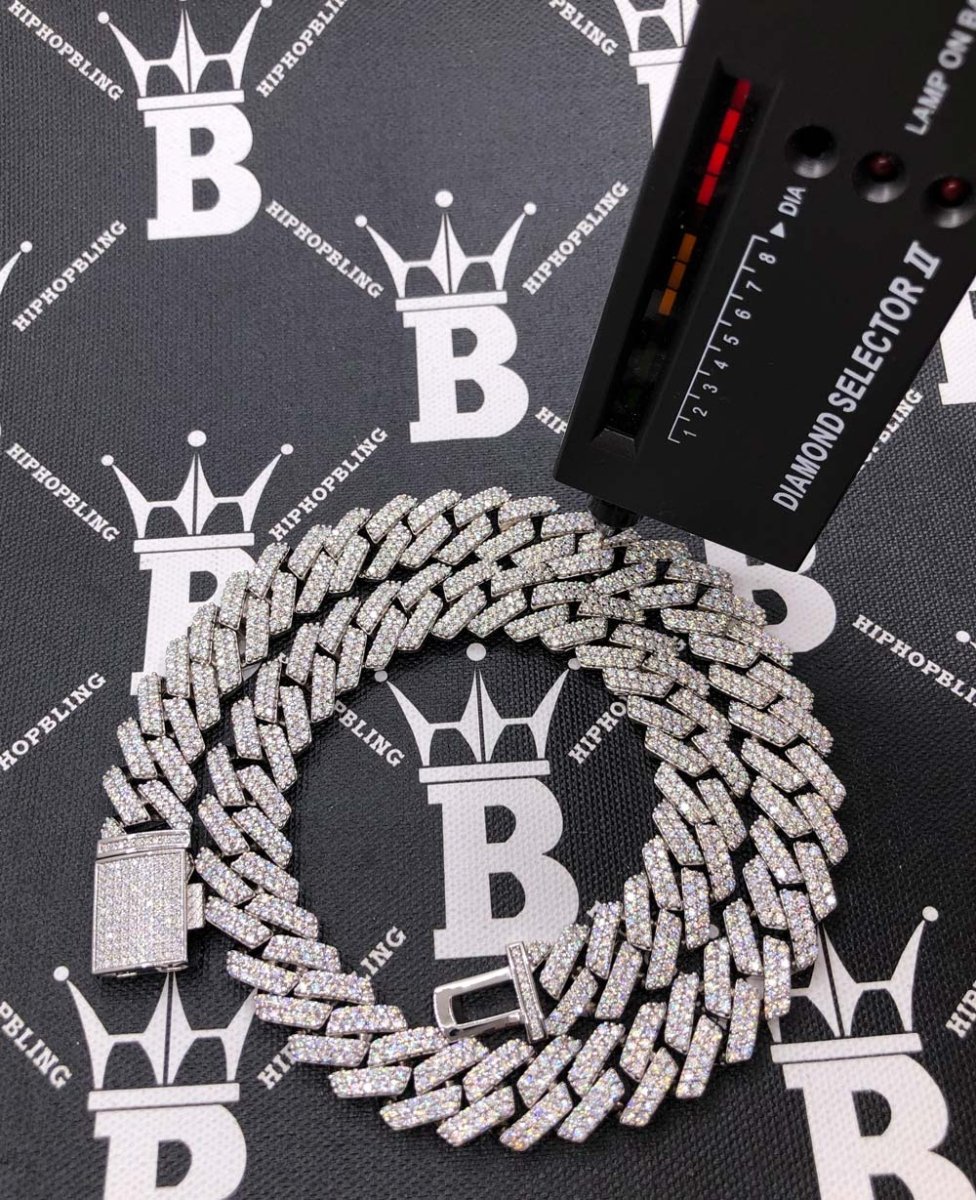 Moissanite Cuban Sharp Link Chain 15MM .925 Silver. This iced out Cuban Chain is simply breathtaking and displays an incredible bling bling shine. We insisted on using the finest Moissanite stones available to craft these perfect high end 'diamond' Iced Out Cuban Link Necklaces. Moissanite stones are carbon based stones just like real Diamonds*. The benefit of our Moissanite Cuban Link Chains are that you get a better shine for much less money. Our Moissanite Stones have a higher refractive index than real Diamonds and rank 9.5 on Mohs hardness scale.