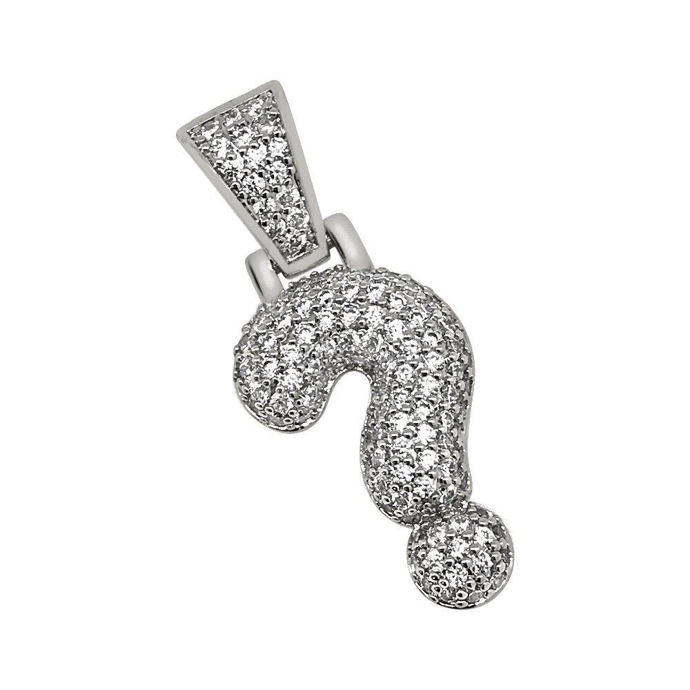 ? Question Mark Symbol Rhodium CZ Bling Bling Pendant. This iced out simulated diamond pendant shines bright. Each stone is set with prongs, no glue! Elevate your swag and stand out from the crowd with this unique bling bling pendant around your neck. Get the bustdown look and feel of a real diamond hip hop pendant for a fraction of the cost. Quality finish and craftsmanship that is made to last. Shine better and order today.