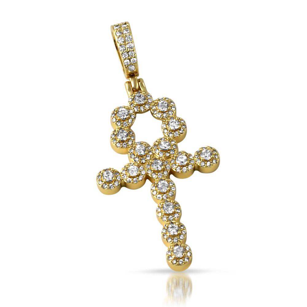Skinny Cluster Ankh Cross CZ Bling Bling Pendant in Gold. This iced out simulated diamond pendant shines bright. Each stone is set with prongs, no glue! Elevate your swag and stand out from the crowd with this unique bling bling pendant around your neck. Get the bustdown look and feel of a real diamond hip hop pendant for a fraction of the cost. Quality finish and craftsmanship that is made to last. Shine better and order today.