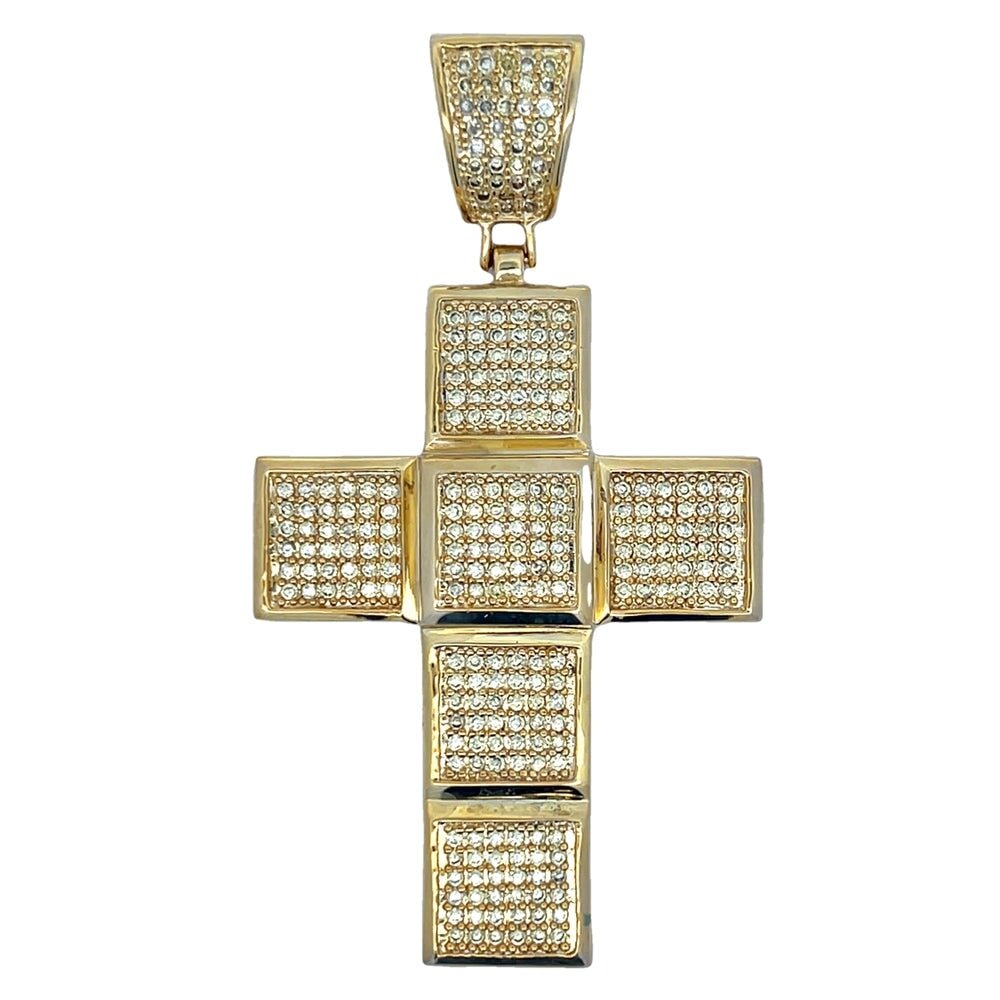 Cube Cross CZ Iced Out Pendant. This iced out simulated diamond pendant shines bright. Each stone is set with prongs, no glue! Elevate your swag and stand out from the crowd with this unique bling bling pendant around your neck. Get the bustdown look and feel of a real diamond hip hop pendant for a fraction of the cost. Quality finish and craftsmanship that is made to last. Shine better and order today.