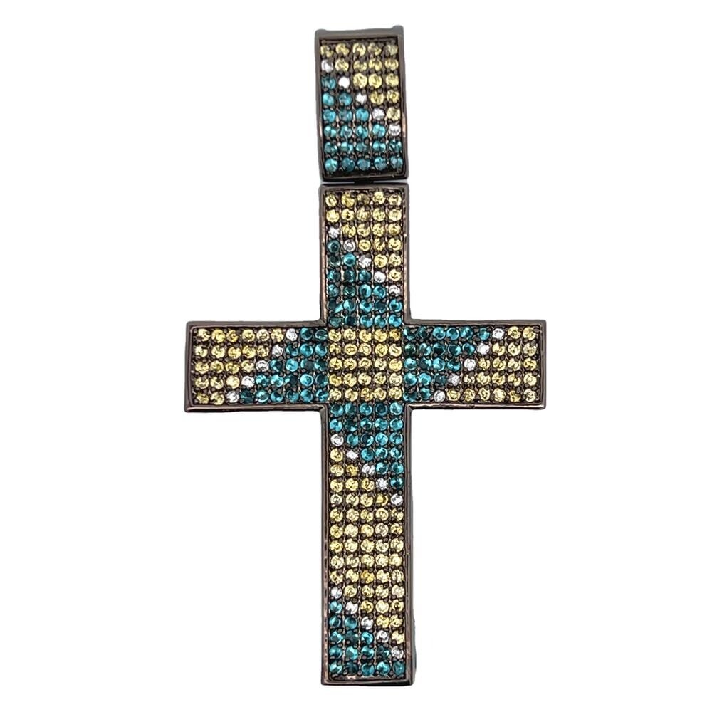 Blue & Yellow Zag CZ Cross Iced Out Pendant