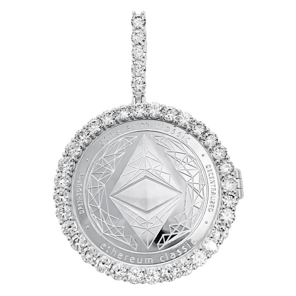 Ethereum Classic Coin Iced Out Frame Pendant. Cryptocurrency has become popular in recent years and here is your opportunity to represent in style! The coin measures 40MM in diameter and is embedded in the frame of your choice. It can be iced up in 2 different says with CZ VVS Simulated Diamonds or in a low key plain frame. This commemorative Crypto Currency coin is sure to turn heads and make a great conversation starter. Available in Yellow Gold or White Gold Plating options. The VVS CZ Simulated Diamonds have a bling bling shine as if they were genuine diamonds.