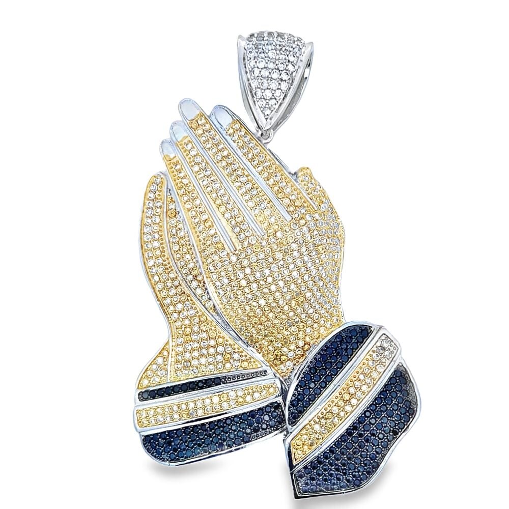 XL Prayer Hands Black & Yellow CZ Iced Out Pendant. This hip hop pendant features round cut simulated diamond stones giving this bling bling charm a unique shine and look to it. Beautifully crafted with precision stone setting. Hot style iced out Pendant that is unique and stands out from the crowd. The VVS CZ Simulated Diamonds have a bling bling shine as if they were genuine diamonds.