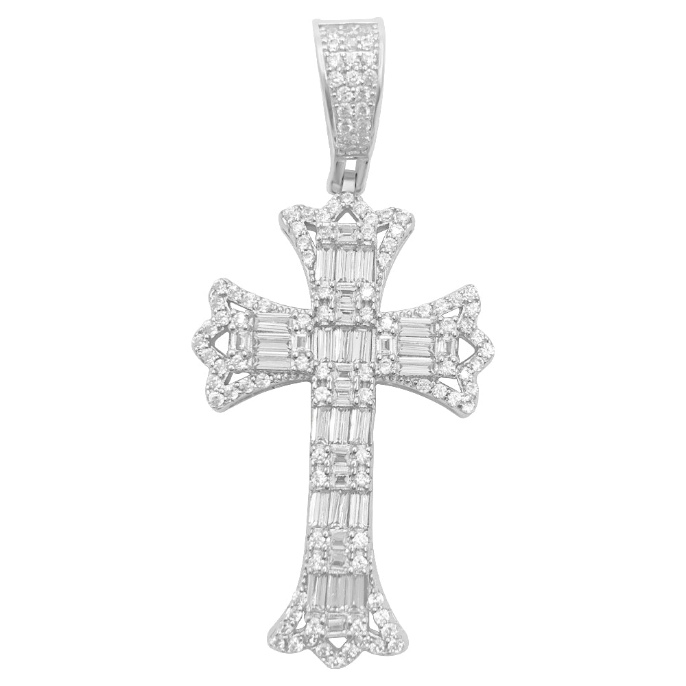 .925 Sterling Silver Baguette Custom Cross VVS CZ Iced Out Pendant. Crafted from Solid .925 Sterling Silver with an incredible bling bling shine. Limited Edition Iced Out Hip Hop Pendant. Stones are VVS Simulated Diamonds Prong Set, the same way genuine diamond hip hop jewelry is made. Stand out from the crowd with this this detailed quality made iced out pendant.