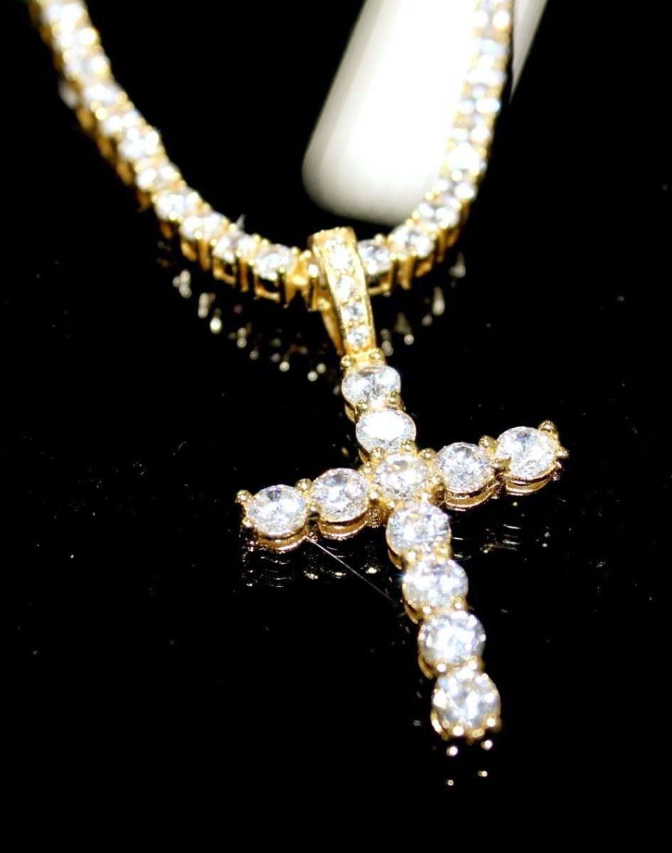 .925 Sterling Silver Tennis Bling Bling Cross Wrapped. Quality crafted bling bling pendant made from real .925 Sterling Silver with all prong set CZ simulated diamond stones. No glue only prong setting. This iced out pendant shines in the most realistic way just like real diamonds. Order your iced out pendant today.