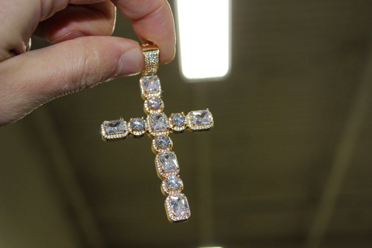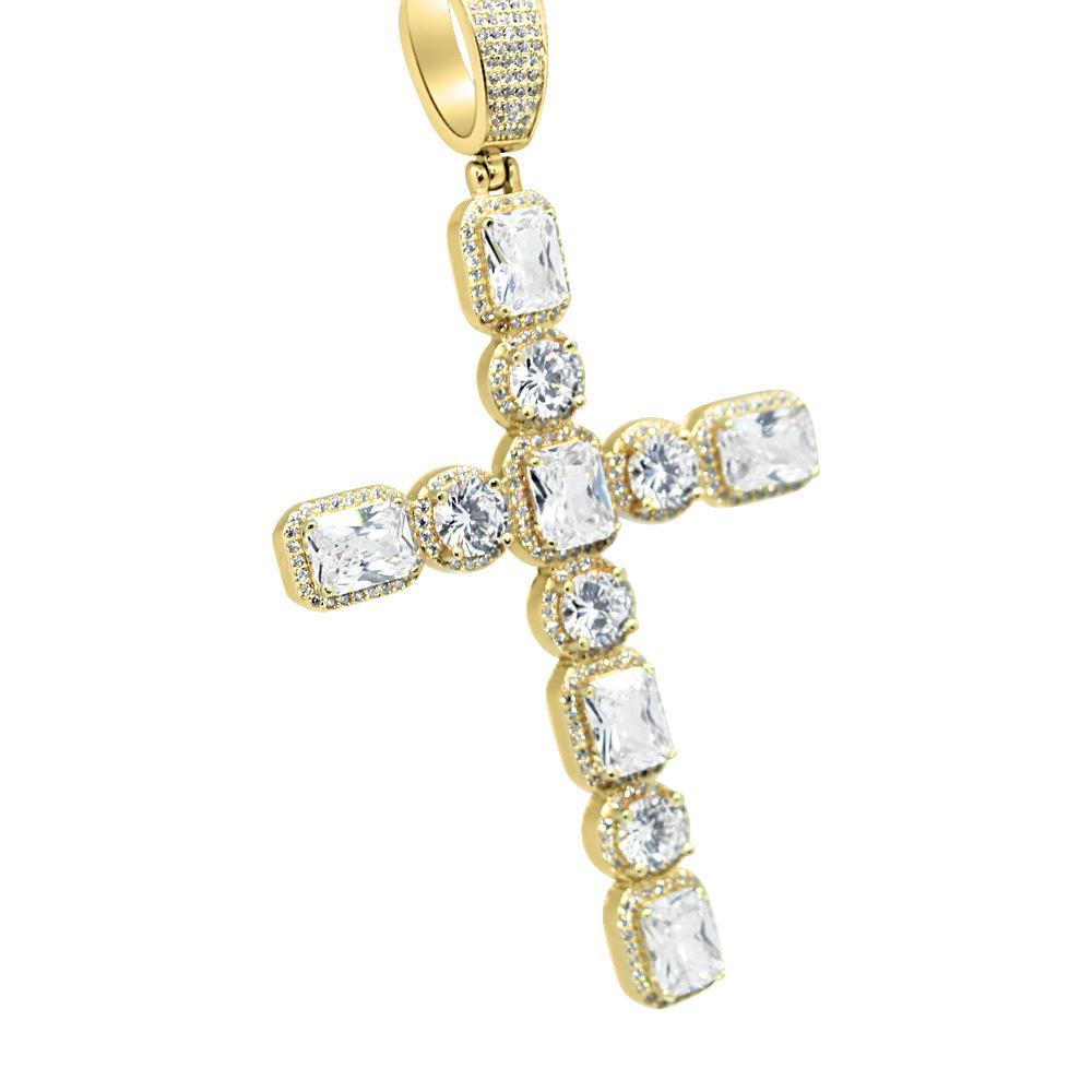 Emerald Cut Round Cut Bling Bling Gold Cross. This iced out simulated diamond pendant shines bright. Each stone is set with prongs, no glue! Elevate your swag and stand out from the crowd with this unique bling bling pendant around your neck. Get the bustdown look and feel of a real diamond hip hop pendant for a fraction of the cost. Quality finish and craftsmanship that is made to last. Shine better and order today.