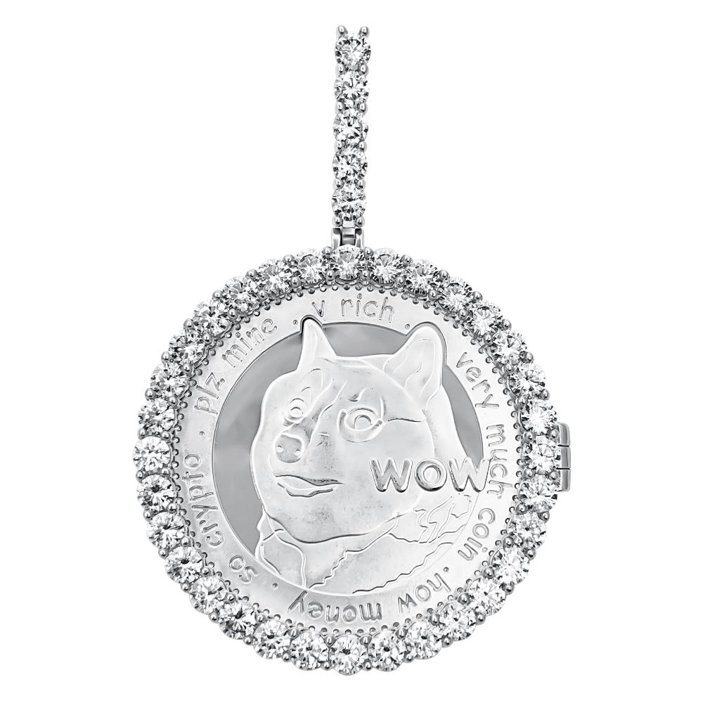 Dogecoin Coin Iced Out Frame Pendant V1. Doge Coin has become popular in the past year and here is your opportunity to represent Dogecoin in style! The coin measures 40MM in diameter and is embedded in the frame of your choice. It can be iced up in 2 different says with CZ VVS Simulated Diamonds or in a low key plain frame. This commemorative Crypto Currency coin is sure to turn heads and make a great conversation starter. Available in Yellow Gold or White Gold Plating options. The VVS CZ Simulated Diamonds have a bling bling shine as if they were genuine diamonds.