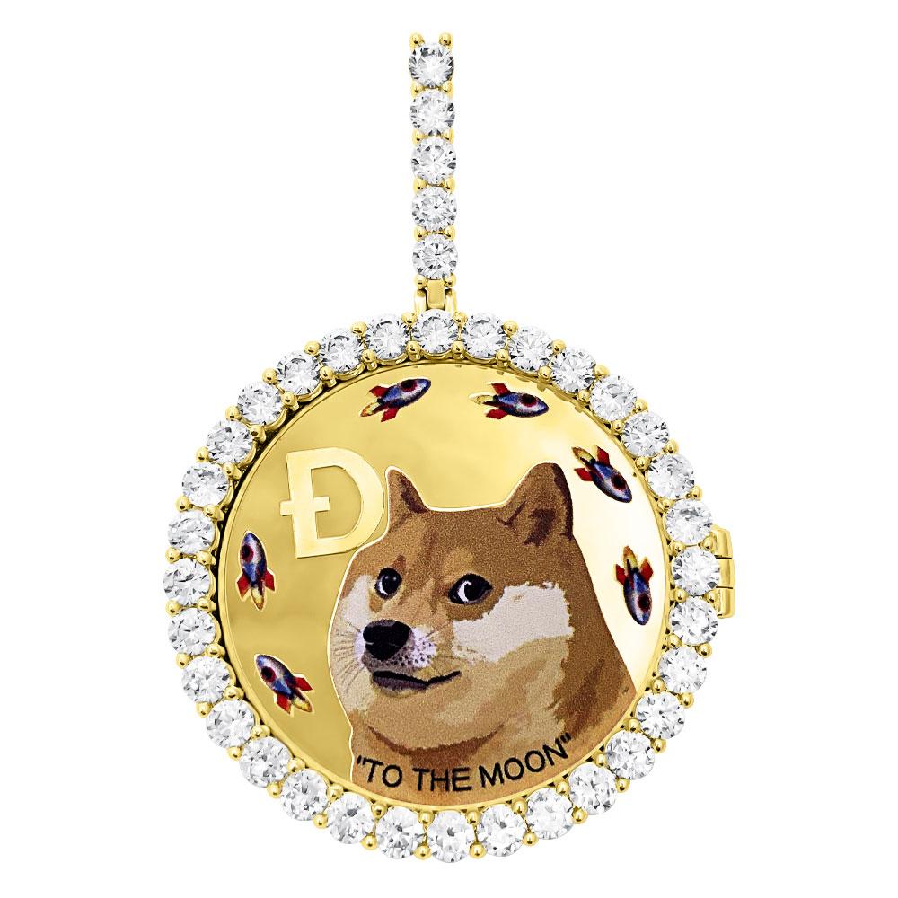 Dogecoin Coin Iced Out Frame Pendant V5. Doge Coin has become popular in the past year and here is your opportunity to represent Dogecoin in style! The coin measures 40MM in diameter and is embedded in the frame of your choice. It can be iced up in 2 different says with CZ VVS Simulated Diamonds or in a low key plain frame. This commemorative Crypto Currency coin is sure to turn heads and make a great conversation starter. Available in Yellow Gold or White Gold Plating options. The VVS CZ Simulated Diamonds have a bling bling shine as if they were genuine diamonds.