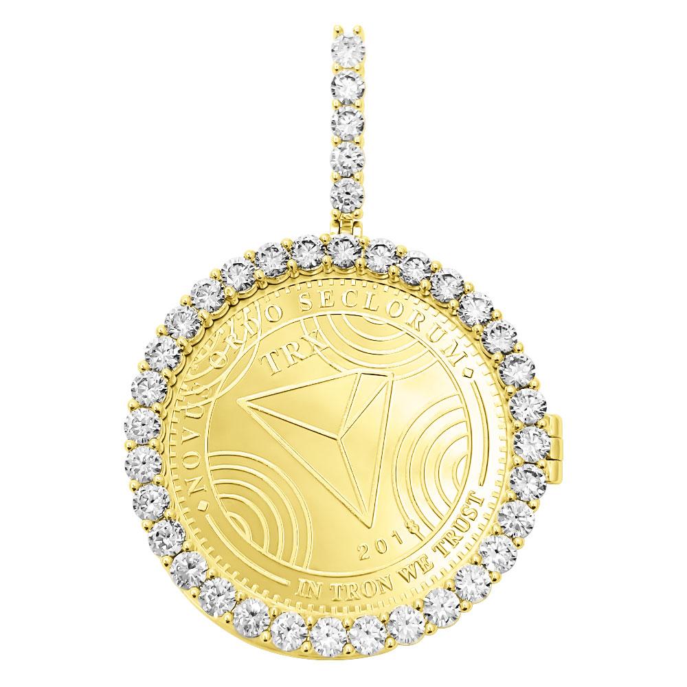 Tron TRX Coin Iced Out Frame Pendant. Cryptocurrency has become popular in recent years and here is your opportunity to represent in style! The coin measures 40MM in diameter and is embedded in the frame of your choice. It can be iced up in 2 different says with CZ VVS Simulated Diamonds or in a low key plain frame. This commemorative Crypto Currency coin is sure to turn heads and make a great conversation starter. Available in Yellow Gold or White Gold Plating options. The VVS CZ Simulated Diamonds have a bling bling shine as if they were genuine diamonds.