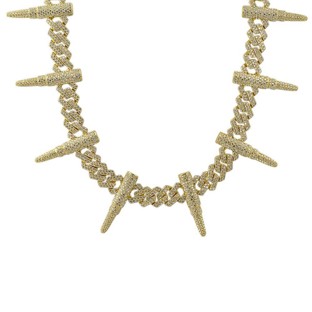 Bullet Cuban Link CZ Hip Hop Iced Out Chain. Unique sharp cuban links with 7.62 style bullet casings (not real bullets) fully iced out prong setting. Domed micro pave stone setting keeps you icey from all angles. Popular Style with shiny Simulated Diamonds prong set on every link. Top quality Simulated Diamonds and bold style that will keep you shining in the club and other exclusive events. Highly detailed with intricate details and stone setting. All stones are VVS Simulated Diamonds that are prong set.