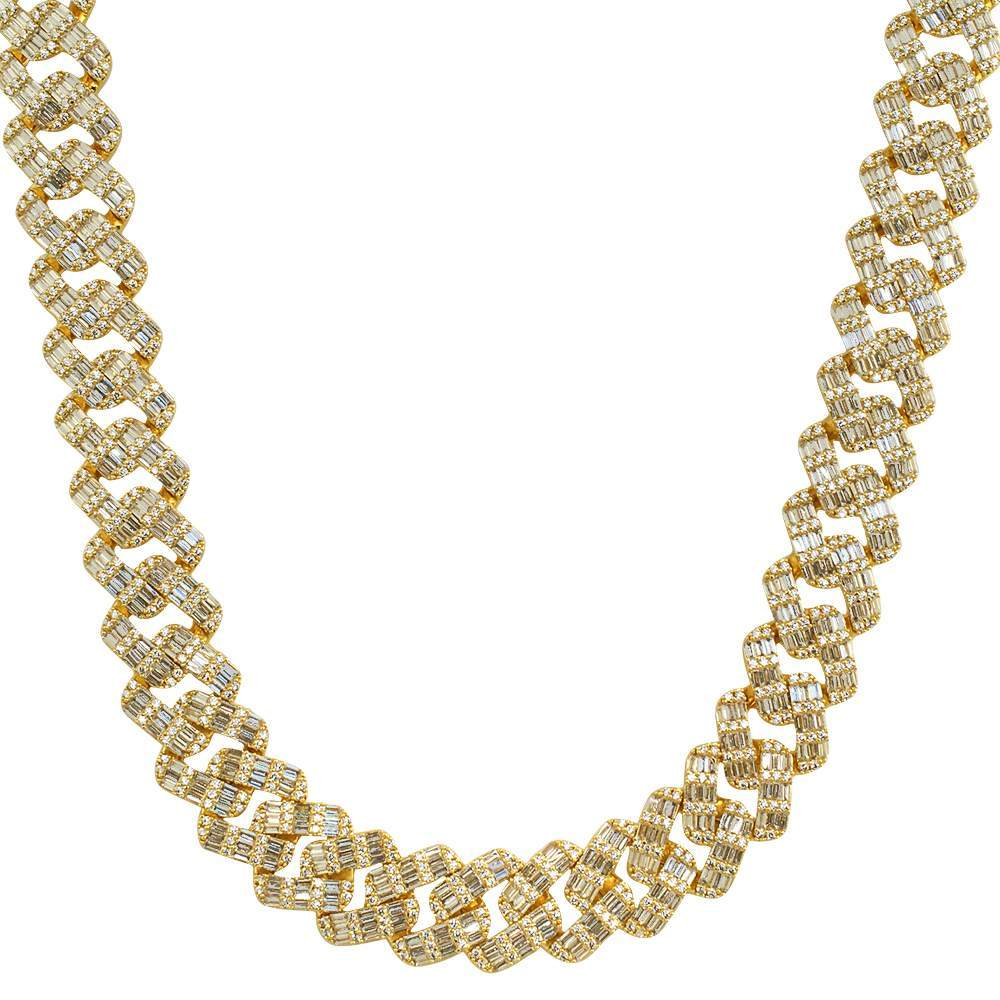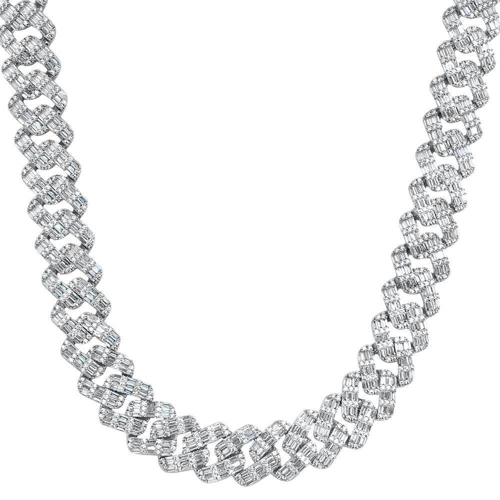 Chunky Baguette Cuban Link CZ Iced Out Chain. Designer made with precision hand setting. Unique Classic chain totally iced out to maximize the Bling Bling Shine. Highly detailed with intricate details and stone setting. All stones are VVS Simulated Diamonds that are prong set.