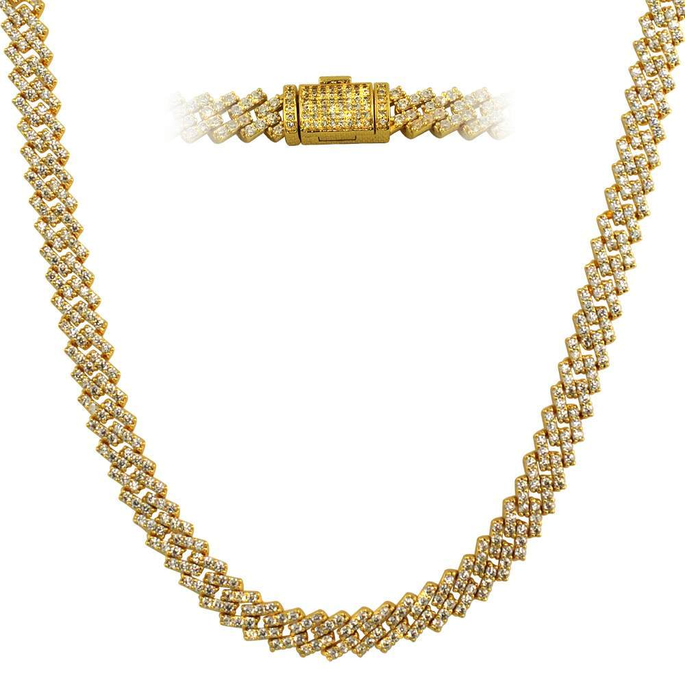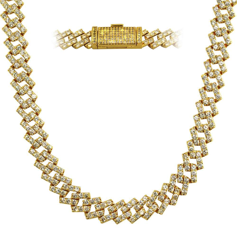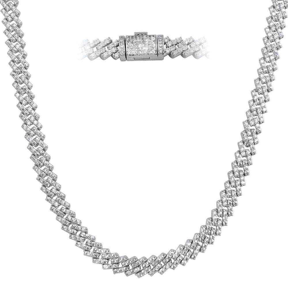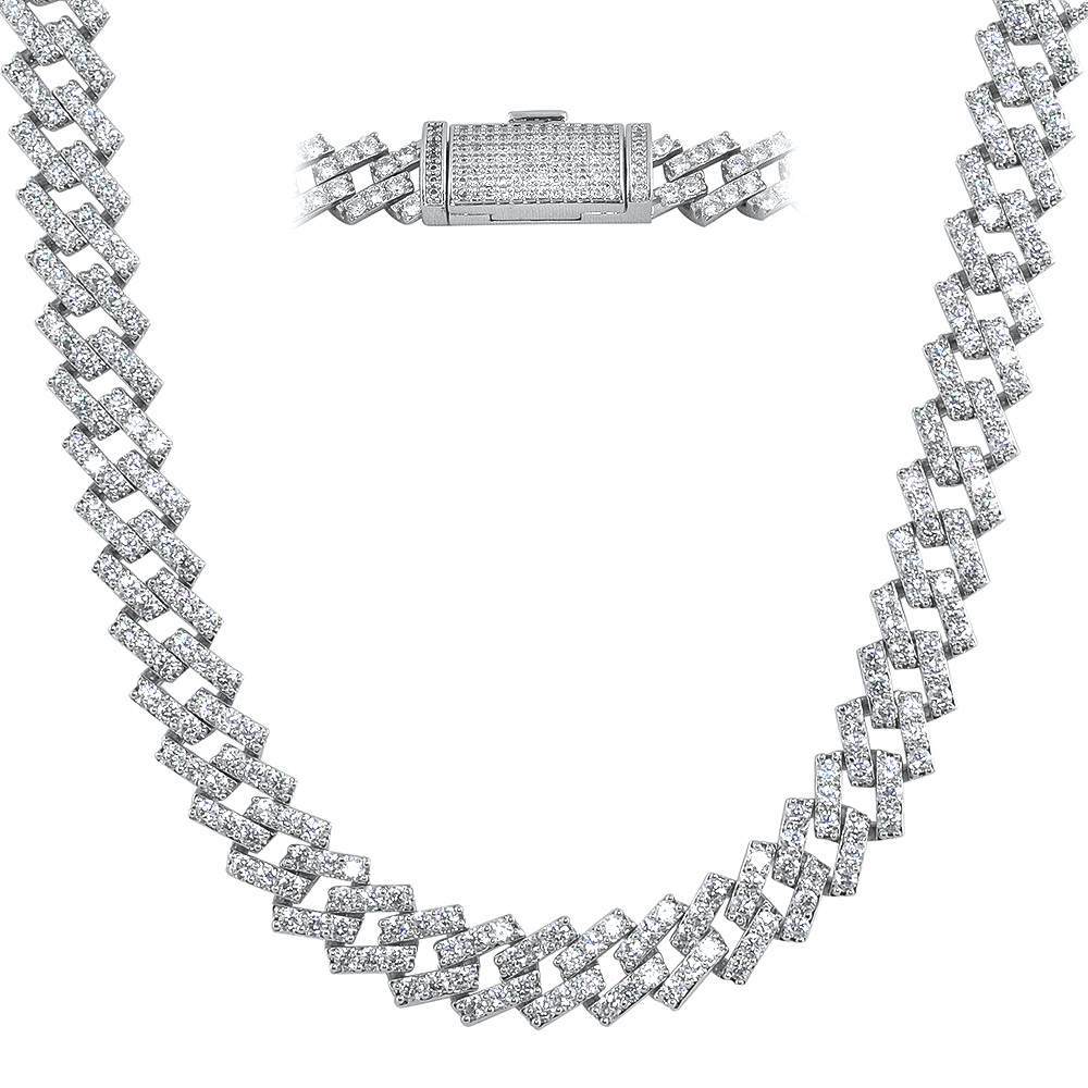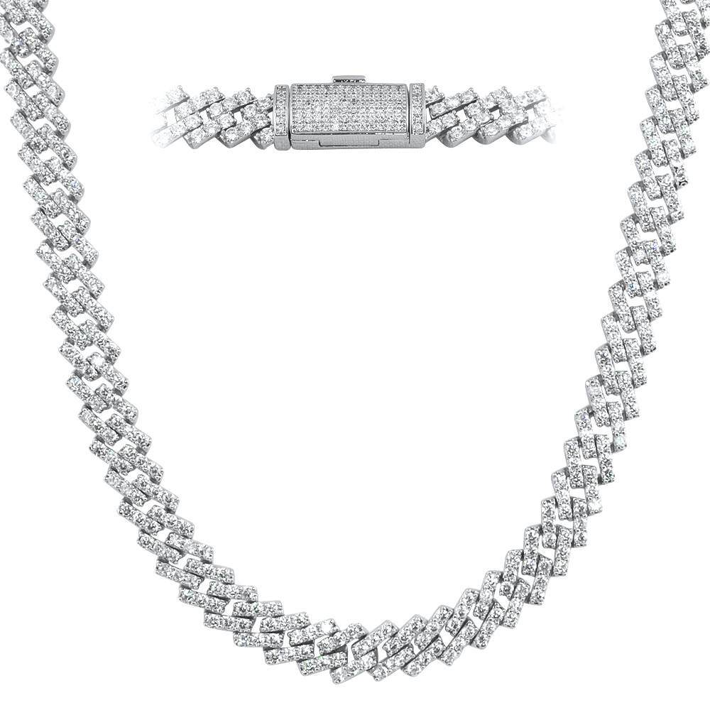 Cuban Box Link CZ Hip Hop Iced Out Bling Chain. Tennis style setting Cuban Box link bling bling chain. Highly detailed with intricate details and stone setting. All stones are VVS Simulated Diamonds that are prong set. Prong Set VVS Simulated Diamonds