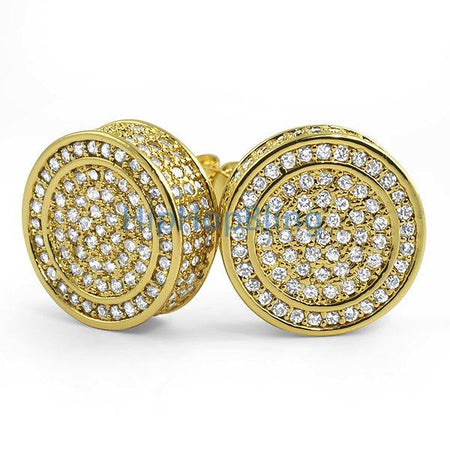 Custom 3D Circle XL Gold CZ Bling Bling Earrings. Get the maximum bling bling shine with these iced out earrings. Quality crafted with intricate details. Stones are VVS Simulated Diamonds which are Prong Set and designed to perfection. Ice up your ears with these amazing hip hop earrings. Order your Hip Hop Bling Earrings today.