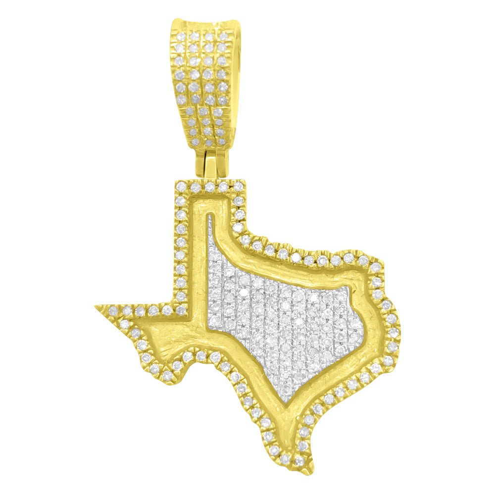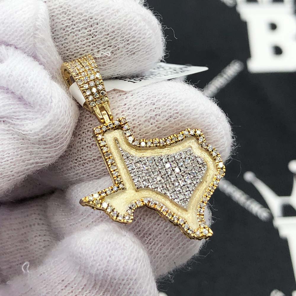 Glow in the Dark Texas Diamond Pendant .38cttw 10K Yellow Gold.  Solid 10K Yellow Gold with Round Cut Genuine Diamonds hand set.  Intricate details with precision micro pave prong setting.  Real bling bling diamond pendant iced out.  All Real Diamond Hip Hop Jewelry with nice details and quality at an affordable price.