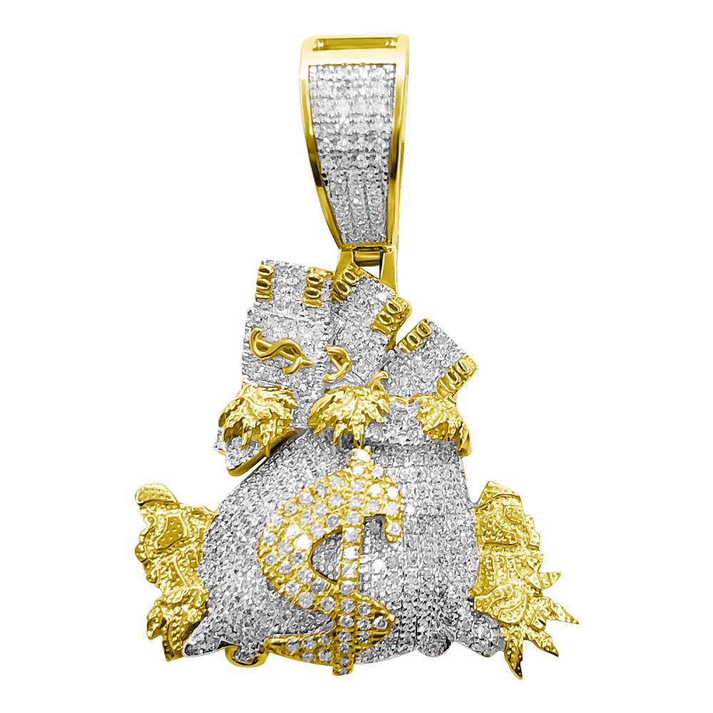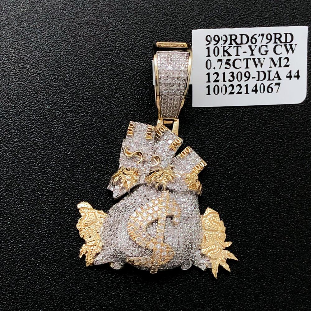 Money Bag Overflowing Diamond Pendant .75cttw 10K Yellow Gold. Solid 10K Yellow Gold with Round Cut Genuine Diamonds hand set. Intricate details with precision micro pave prong setting. Real bling bling diamond pendant iced out. All Real Diamond Hip Hop Jewelry with nice details and quality at an affordable price.