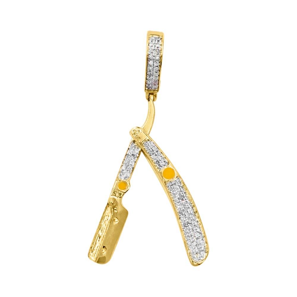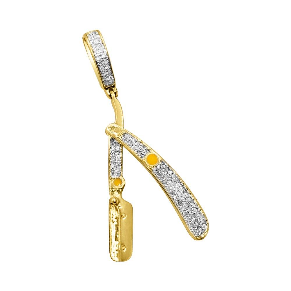 Barber Straight Razor Diamond Pendant .26cttw 10K Yellow Gold.  Solid 10K Yellow Gold with Genuine Diamonds Round Cut and hand set.  Intricate details with precision micro pave prong setting.  Real bling bling diamond pendant iced out.  All Real Diamond Hip Hop Jewelry with nice details and quality at an affordable price.