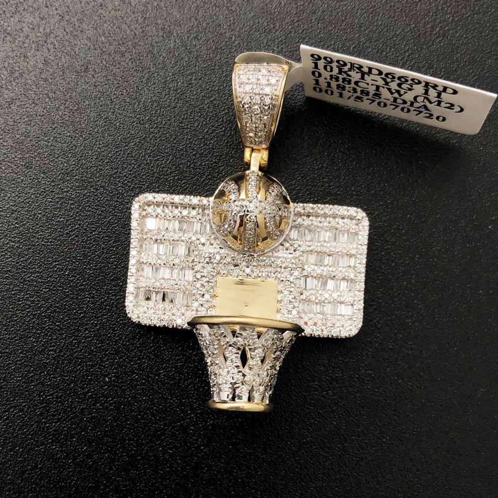 Basketball Hoop Rim Baguette Diamond .88 Carat Pendant 10K Yellow Gold. Solid 10K Yellow Gold with Genuine Diamonds baguette and Round Cut Micro Pave Prong Set. Real Diamond Hip Hop Jewelry with nice details and quality at an affordable price