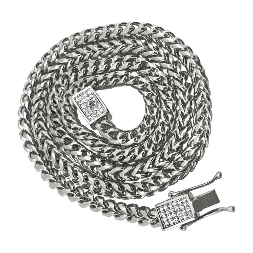 CZ Box Clasp Triple LockStainless Steel Franco Chain Necklace. A hip hop jewelry classic with added bling bling. You can wear this with anything it is so versatile. Made from Solid Stainless Steel andhigh polished so you know it will stay shining. Stones are Prong Set with VVS Simulated Diamonds. Choose from 4MM and 6MM Wide Franco Hip Hop Chains.