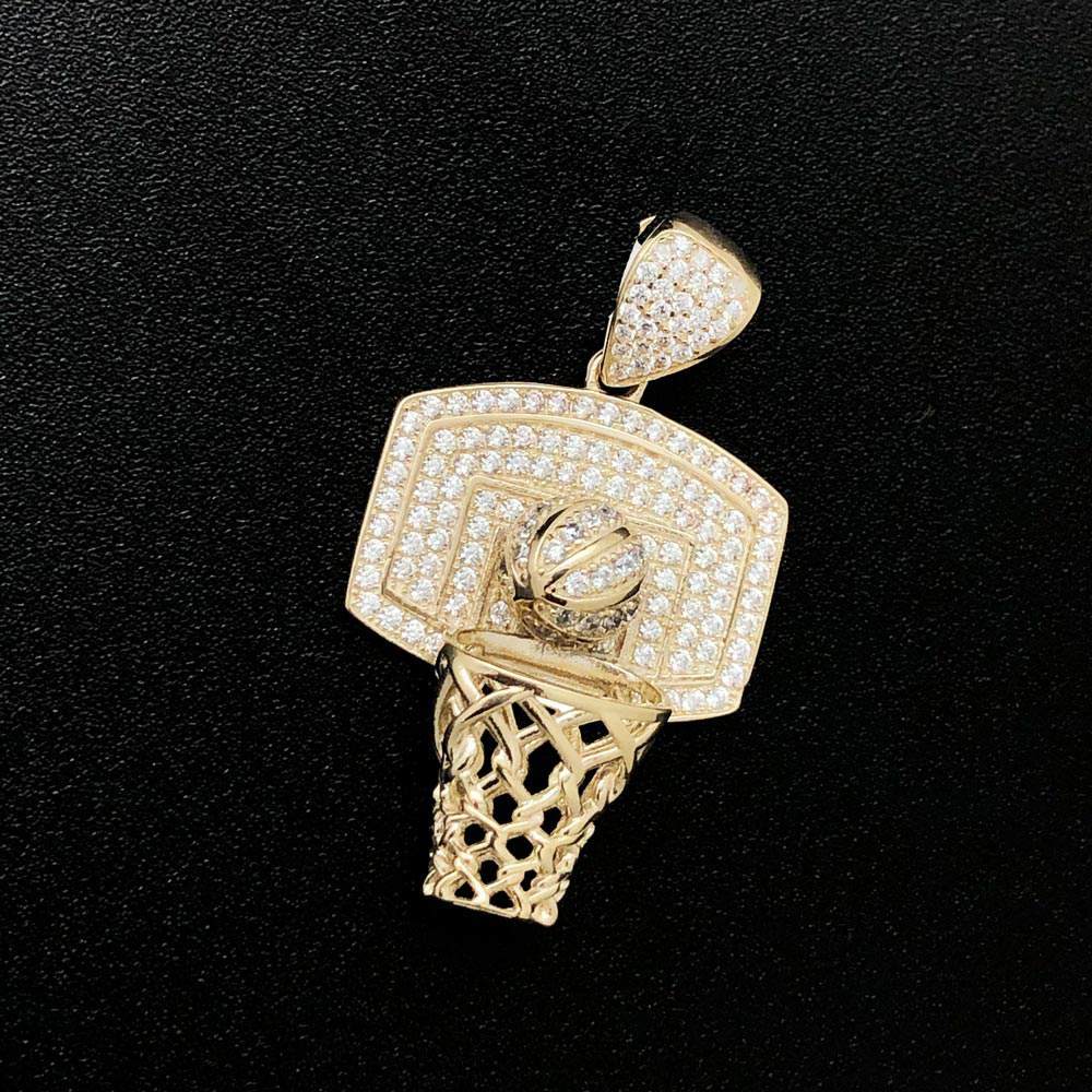 Basketball Hoop CZ 10K Yellow Gold Pendant. Crafted from Solid 10K Yellow Gold and highly detailed. Prong set CZ Simulated Stones that shine like diamonds at a fraction of the cost. Hip Hop Bling Bling style jewelry. Solid gold that never fades with the benefits of Diamonds without the cost. All real Gold quality made at an affordable price.