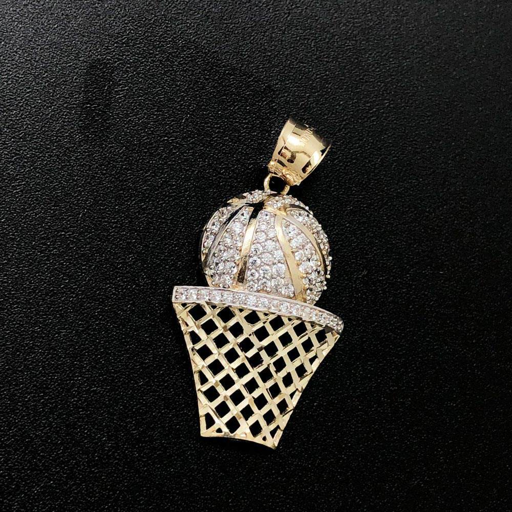 Basketball Rim Net CZ 10K Yellow Gold Pendant. Crafted from Solid 10K Yellow Gold and highly detailed. Prong set CZ Simulated Stones that shine like diamonds at a fraction of the cost. Hip Hop Bling Bling style jewelry. Solid gold that never fades with the benefits of Diamonds without the cost. All real Gold quality made at an affordable price.
