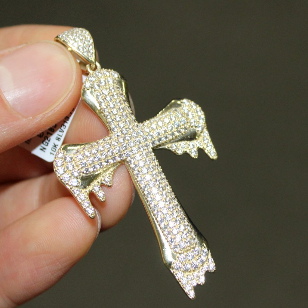 Drip Designer Cross Pendant VVS CZ 10K Yellow Gold. Solid 10K Yellow Gold VVS Bling Bling Hip Hop Cross. Made out of Real Solid 10K Yellow Gold with Simulated VVS Stones. Real 10K Gold and Simulated Diamonds are the best value because you get the genuine precious metal that doesn't tarnish and has melt value. Combined with stones that look identical to VVS diamonds but cost next to nothing when comparing price. Maximize your value and buying power saving thousands of dollars for the near identical look with this bling bling 10K Yellow Gold Hip Hop Cross.