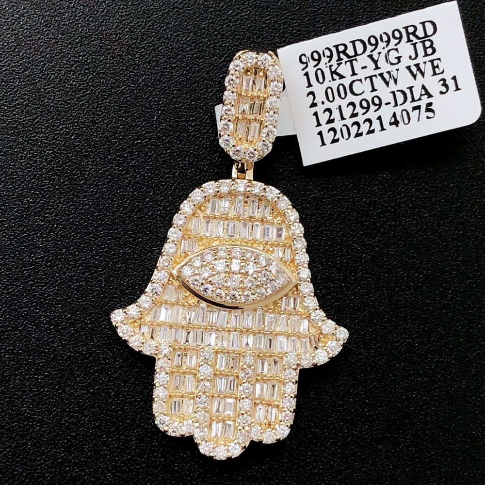 Hamsa Baguette Diamond Pendant 2.00cttw 10K Yellow Gold. Solid 10K Yellow Gold with Round Cut and Baguette Cut Genuine Diamonds hand set. Intricate details with precision micro pave prong setting. Real bling bling diamond pendant iced out. All Real Diamond Hip Hop Jewelry with nice details and quality at an affordable price.