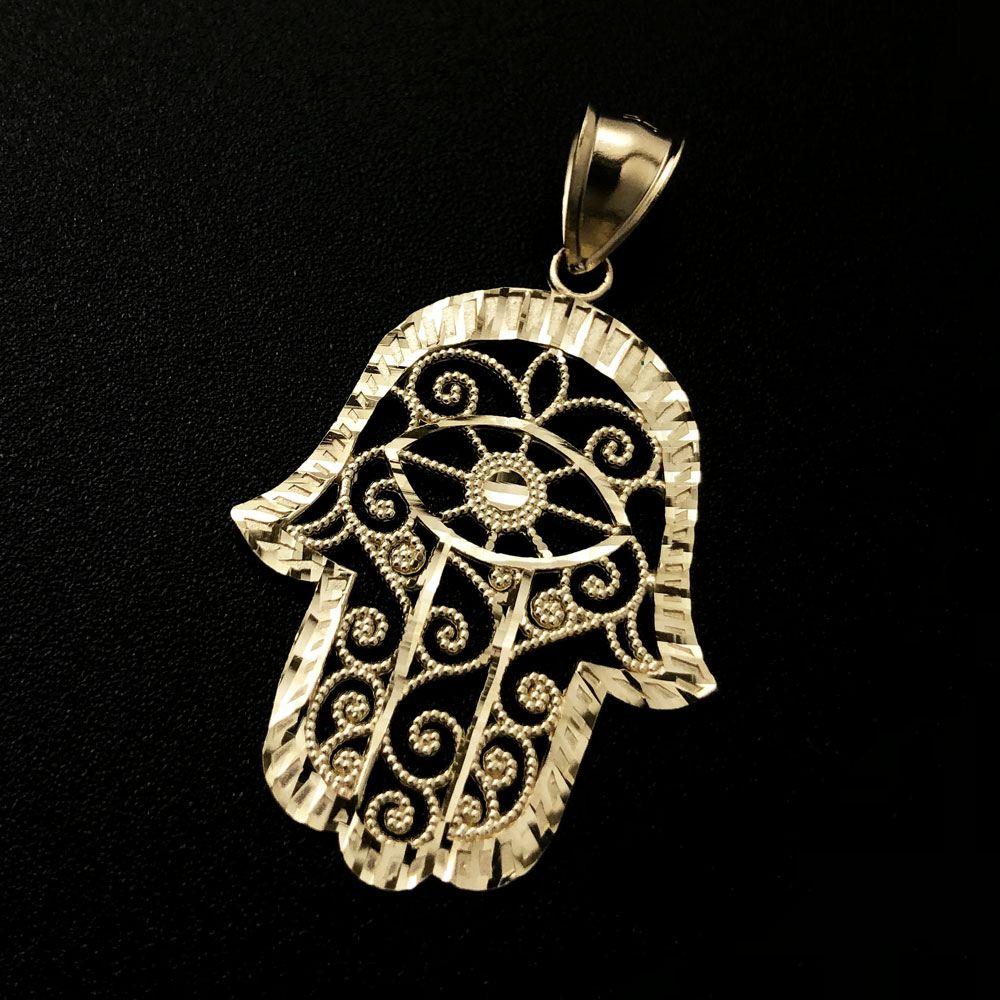Hamsa Hand Filgaree DC 10K Yellow Gold Pendant. Crafted from Solid 10K Yellow Gold and highly detailed with Diamond Cuts for added sparkle. All real Gold quality made at an affordable price.