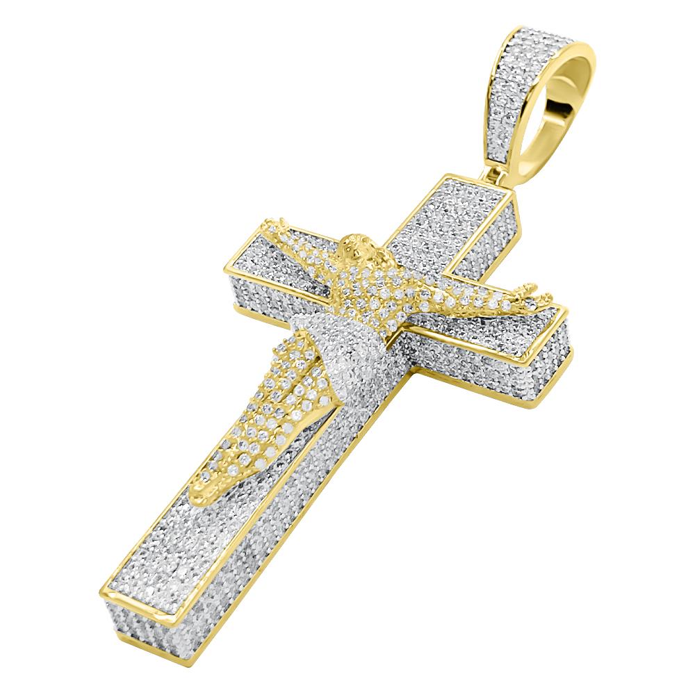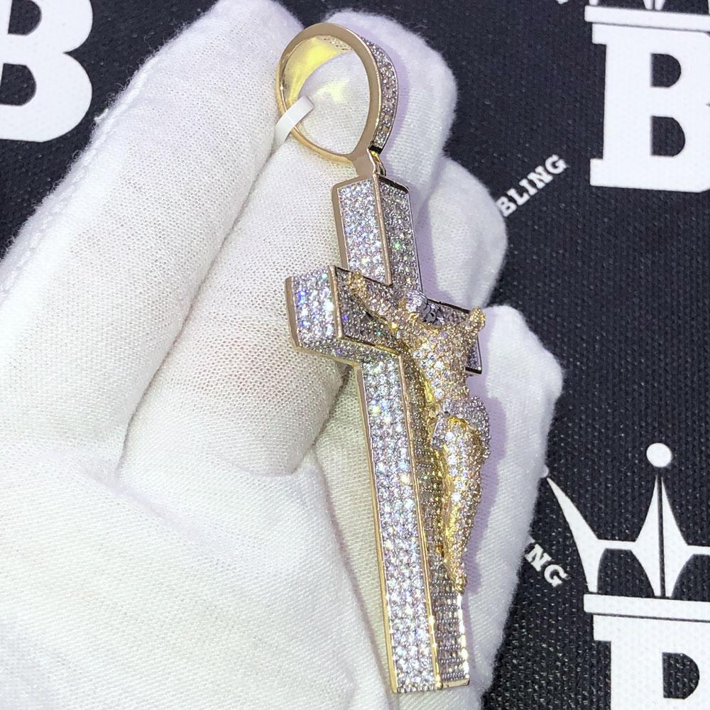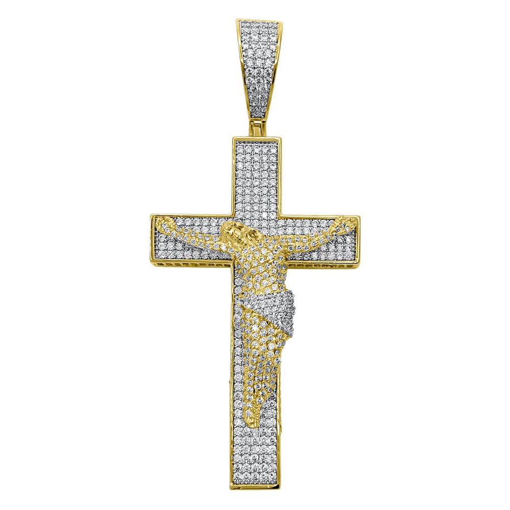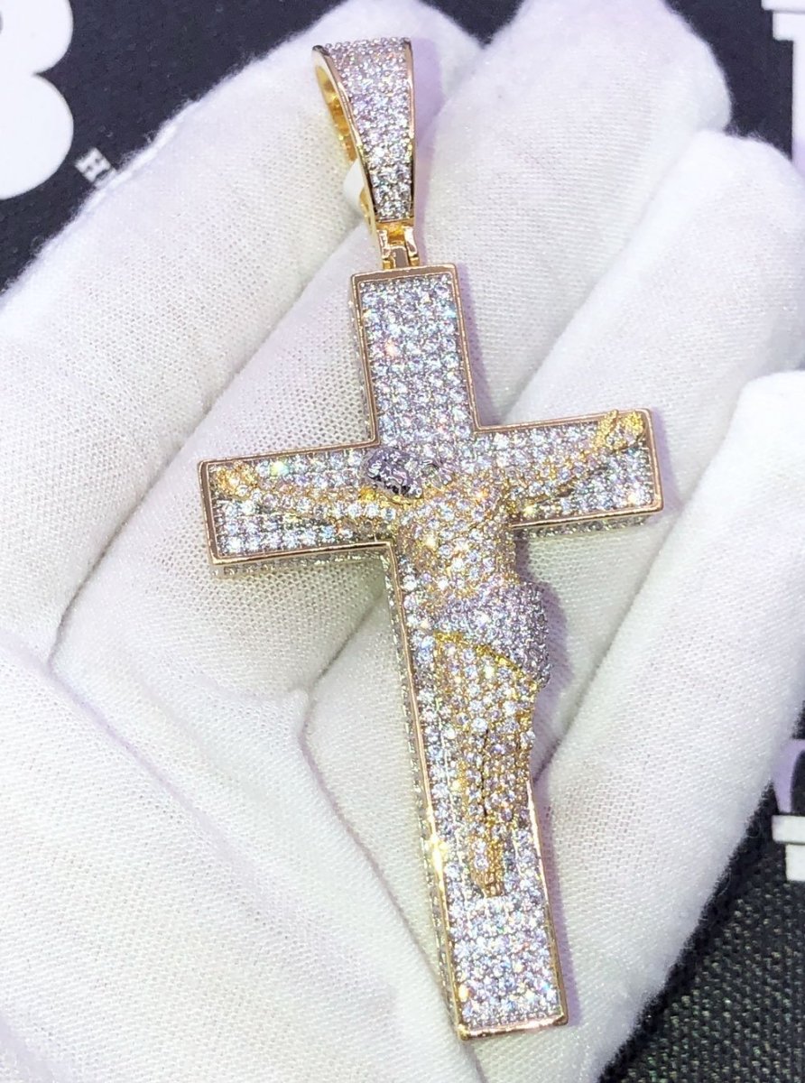 Jesus Crucifix Pave Cross CZ Hip Hop Iced Out Pendant. Limited Edition Iced Out Hip Hop Pendant. Stones are Round Cut VVS Simulated Diamonds Prong Set, the same way genuine diamond hip hop jewelry is made. Stand out from the crowd with this this detailed quality made iced out pendant.