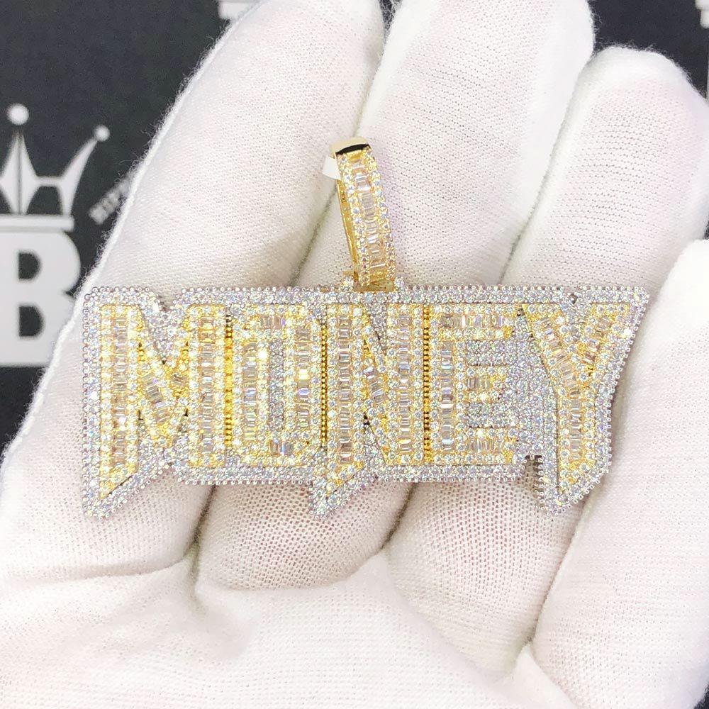 Money Baguette Plaque VVS CZ Hip Hop Iced Out Pendant. Limited Edition Iced Out Hip Hop Pendant. Stones are VVS Simulated Diamonds Prong Set, the same way genuine diamond hip hop jewelry is made. Stand out from the crowd with this this detailed quality made iced out pendant.